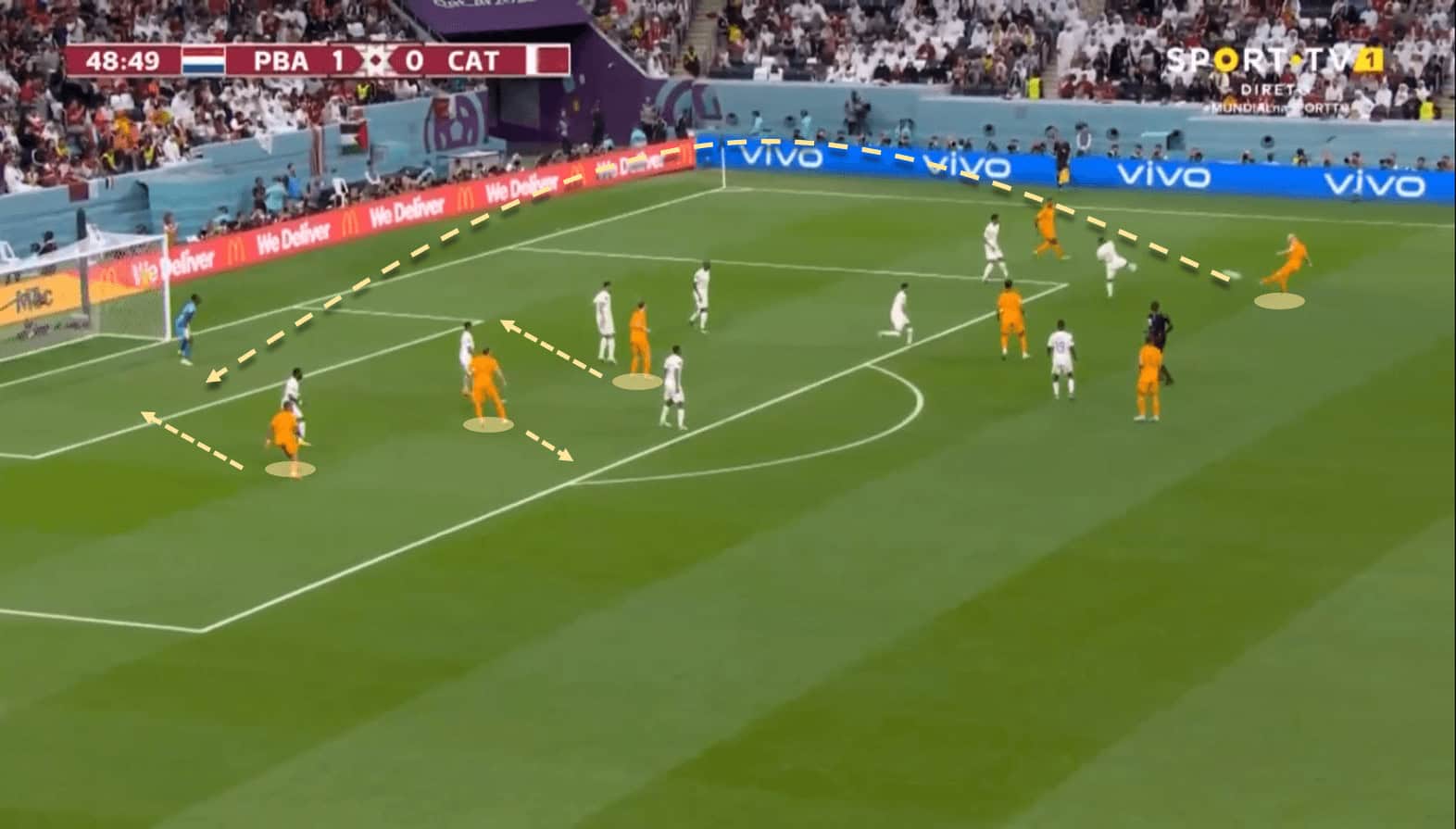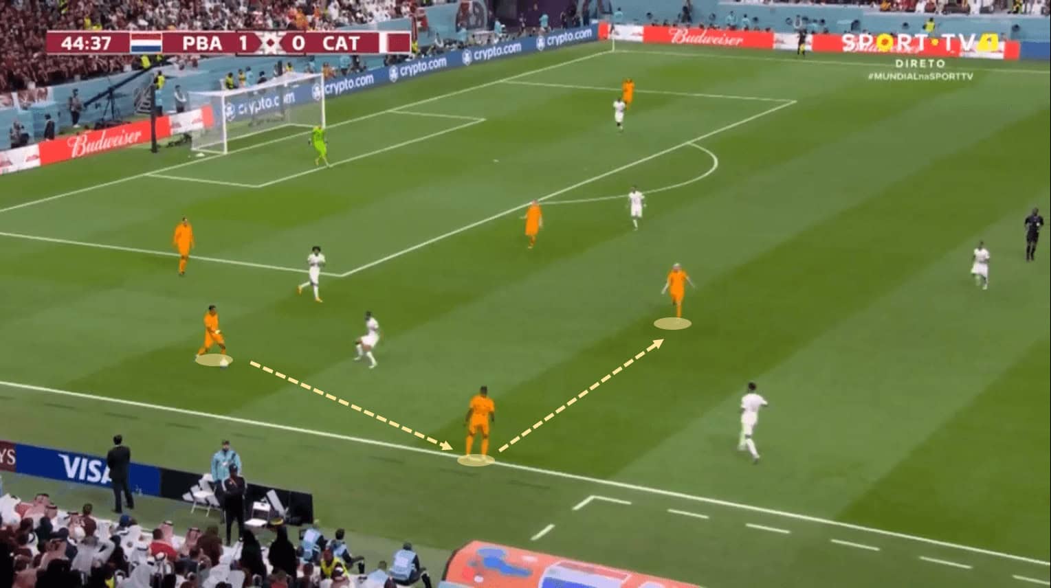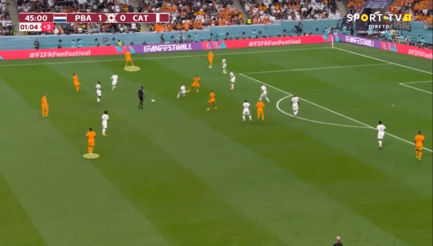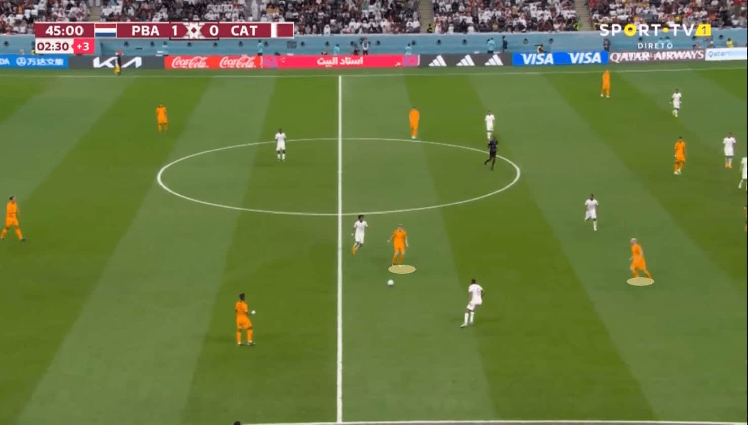 So the tactical adjustments continued to be seen during the course of the game: De Roon tried to go wide open, pinning one of the Qatari wing-backs well on the wide channels, stretching the last defensive line, which could be attacked between the spaces for the players more on the outside like Blind or Dumfries, but also inside at the edge of the box by Gakpo, Depay or Klaasen.