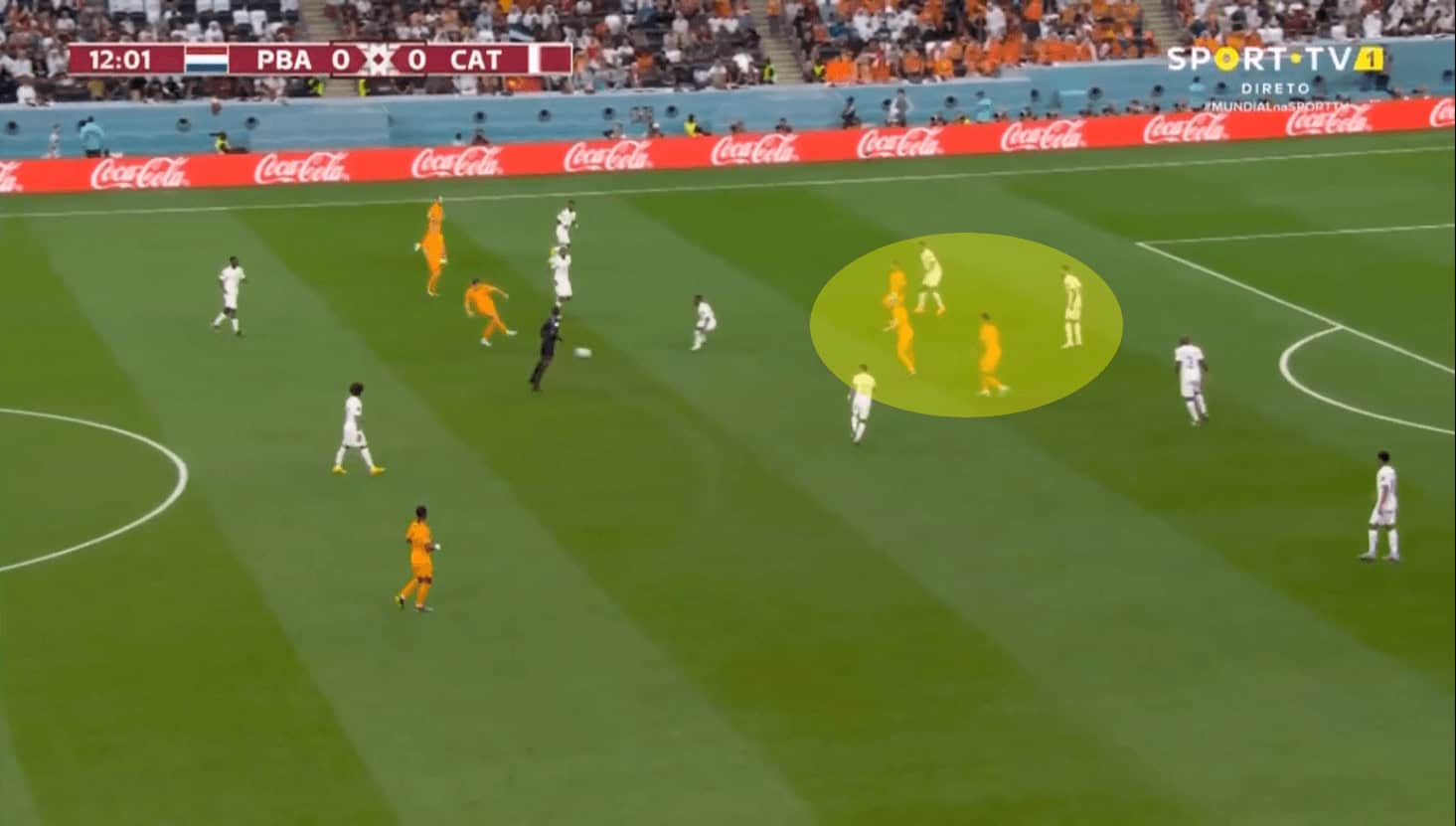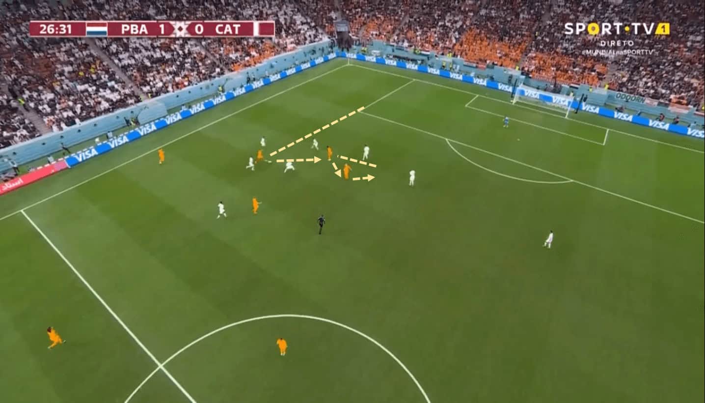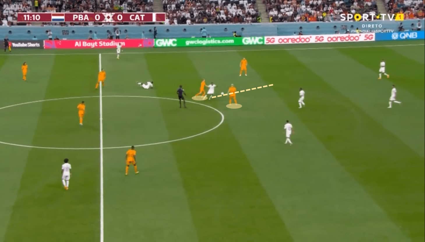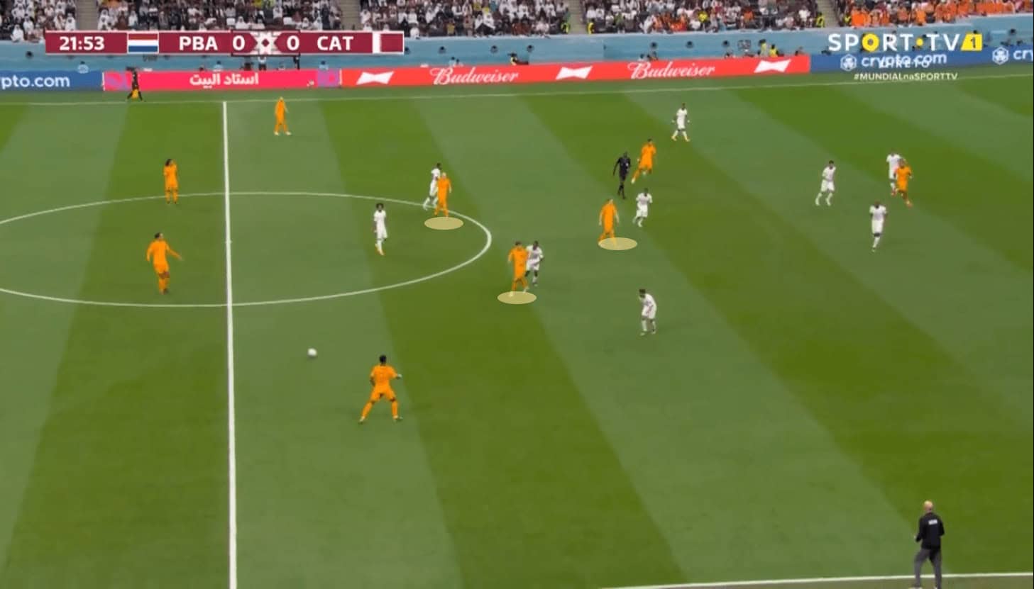 So the tactical adjustments continued to be seen during the course of the game: De Roon tried to go wide open, pinning one of the Qatari wing-backs well on the wide channels, stretching the last defensive line, which could be attacked between the spaces for the players more on the outside like Blind or Dumfries, but also inside at the edge of the box by Gakpo, Depay or Klaasen.
