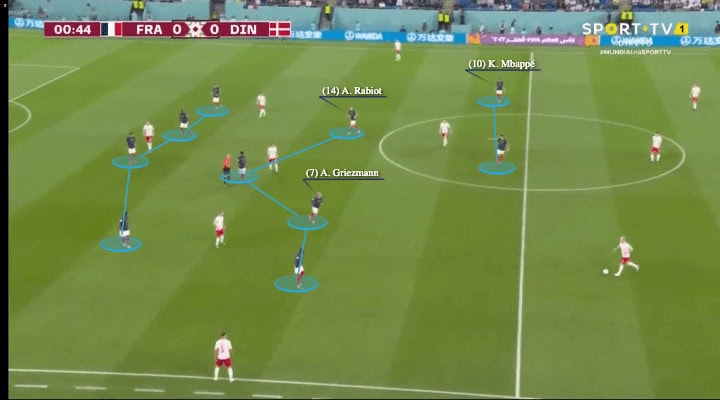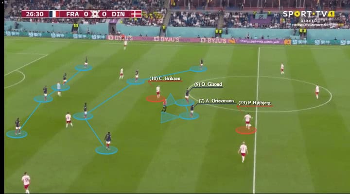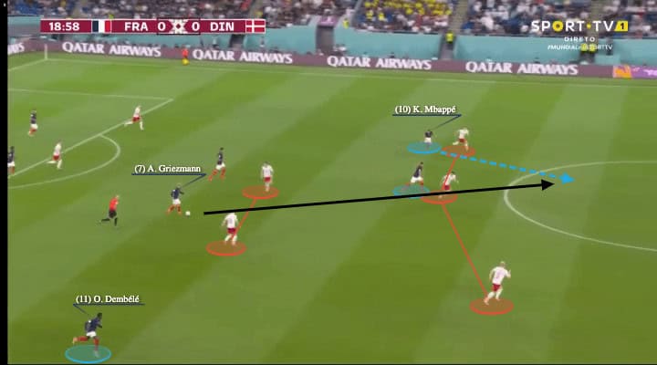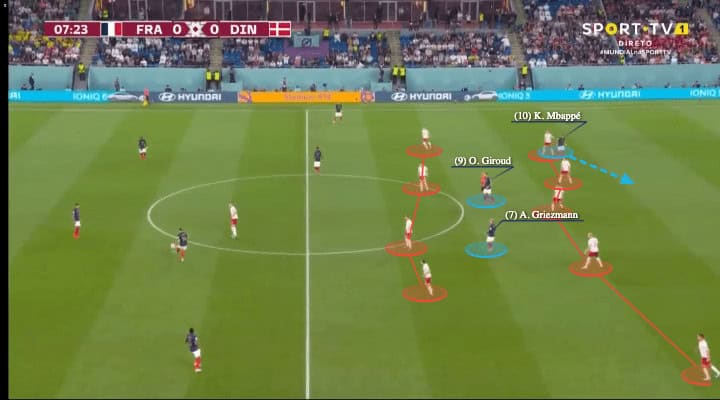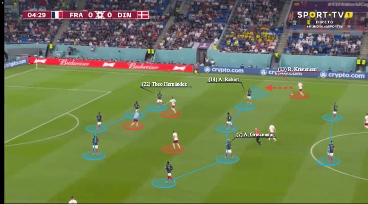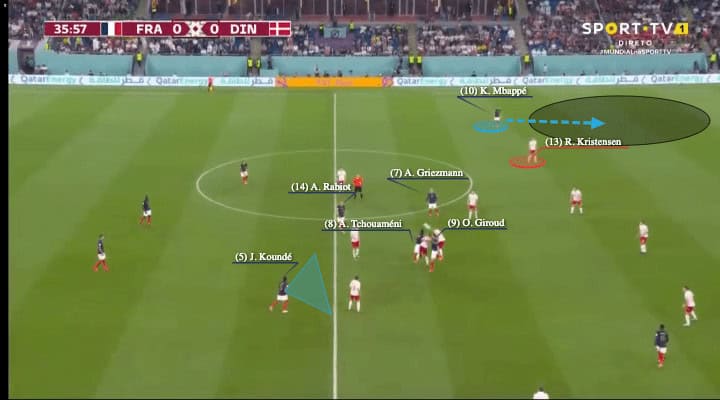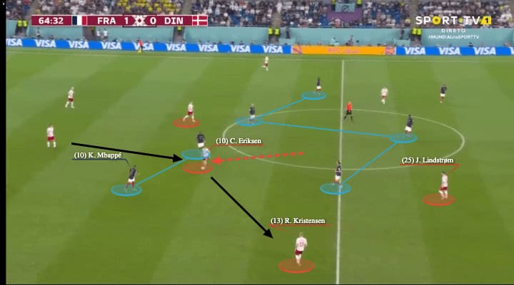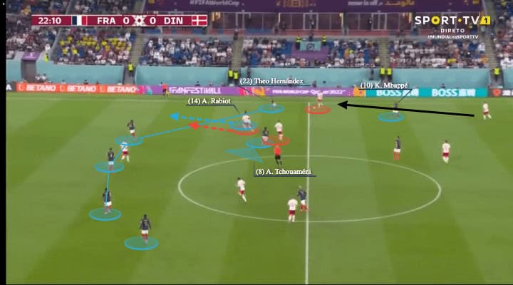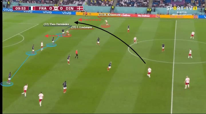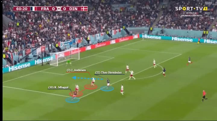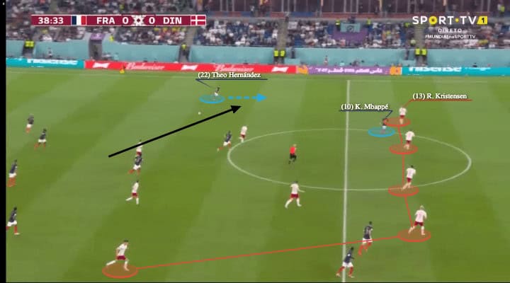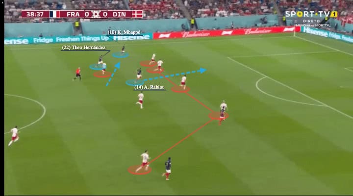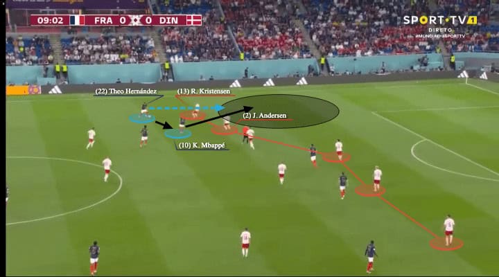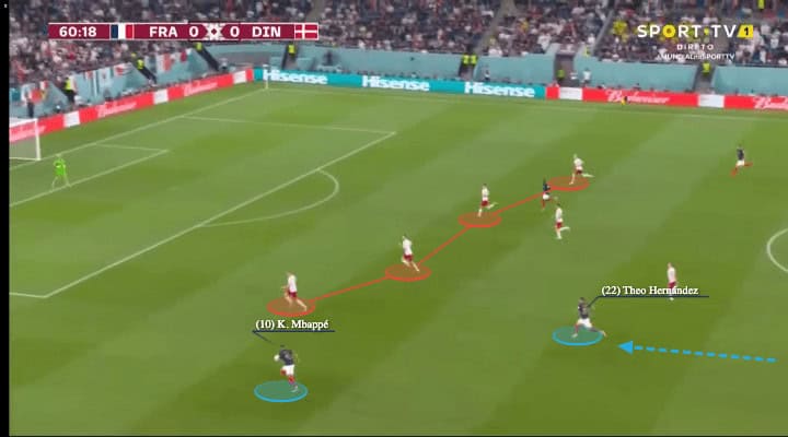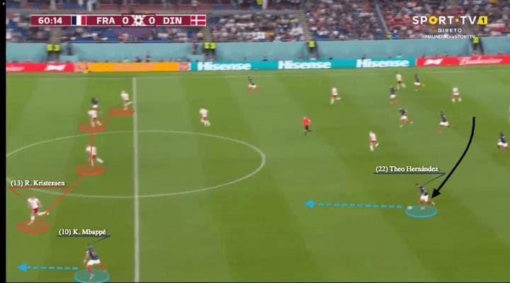 Here, in the beginning, was very similar to the goal as Theo carried the ball forward, France had a 2v1 on Kristensen temporarily as Mbappé’s position occupied the defender.