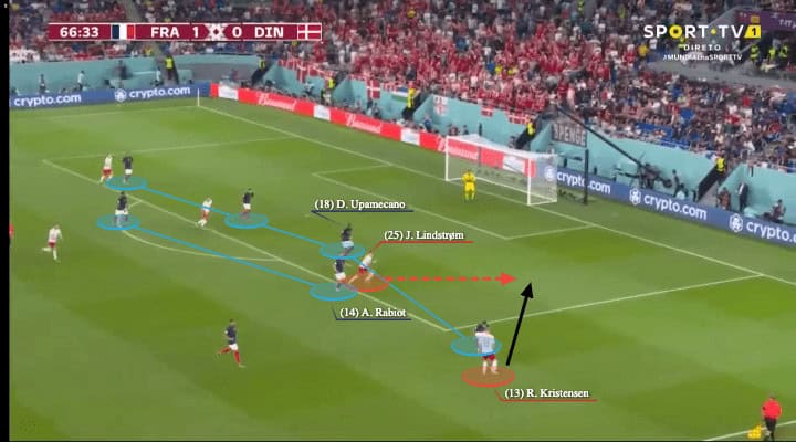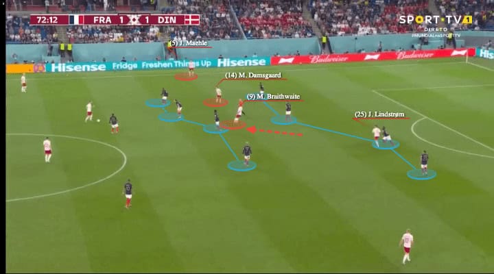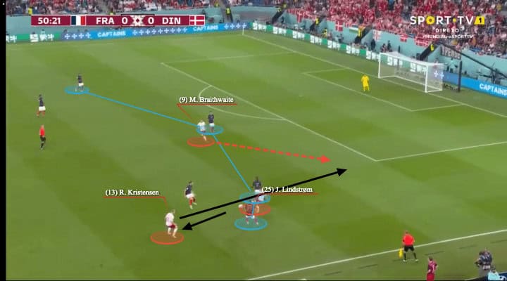 Here, it was nice that Lindstrøm and Kristensen combined and they found the ball behind the France defence, with the substitute, Martin Braithwaite hunting for the pass. But when the striker moved away from the penalty box, who would be at the end of the cross? No one. So even if Denmark breached the first line or made some progression in attack, without the wing-back and 10 from the opposite side arriving at finishing positions, they could not generate too much threat.