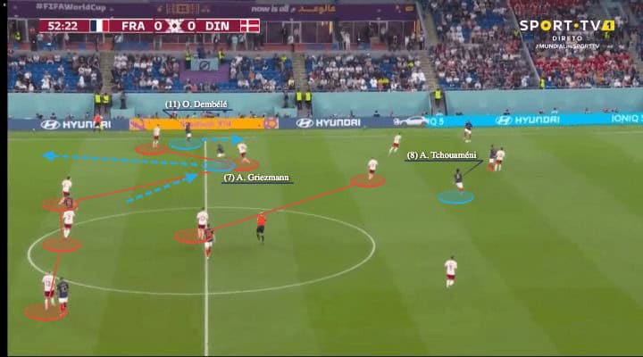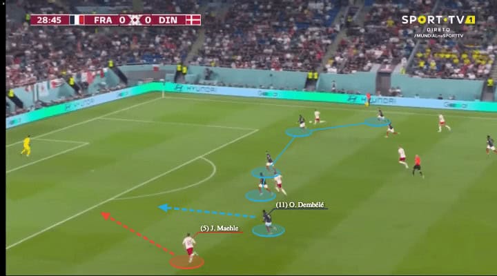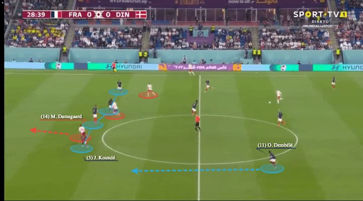 In this scenario, we saw Denmark attacking with a narrow front three again, but France were able to use offside to control the runs of Damsgaard and Cornelius, but you could see the effect of those efforts was to draw Koundé into a narrower position. Here, we also marked Dembélé’s starting position as a winger and now he came back to defend for his team.