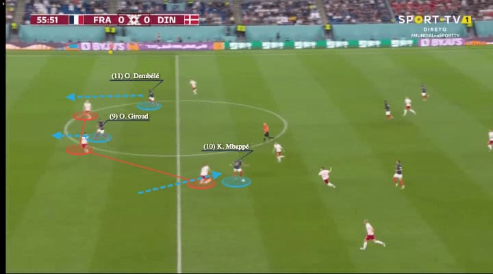 Firstly, because Giroud was somehow between two defenders, and the ball was on Denmarks’ right side, Christensen and Nelsson needed to watch the ball and watch Giroud. But then Dembélé could go behind via Nelsson’s blindside. Meanwhile, because Giroud kept Christensen in the centre, Andersen was isolated against Mbappé in big space, where he was beaten by the PSG star’s silky skill and France get the ball forward easily in the counter-attack.