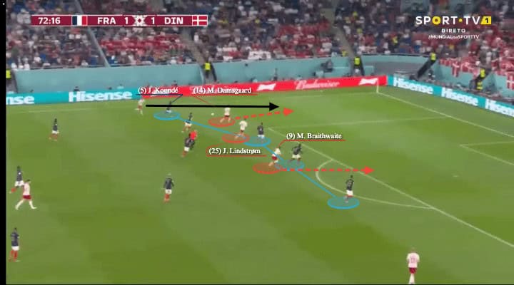 As Braithwaite’s position took out Varane in the first place, Denmark’s outside-in pattern was able to breach behind the defence again with the runs behind the full-back. Here, as Mæhle received, he dragged Koundé out and Damsgaard took advantage of that surface behind, then this was one of the best opportunities Denmark created as they also had Lindstrøm and Braithwaite in finishing positions for the cross.