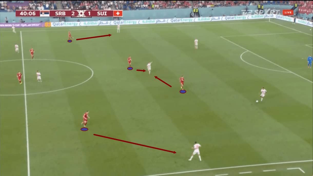 The strikers were responsible for Switzerland’s centre-backs and pressed from out to in, keeping the full-backs in their cover shadows. Meanwhile, Serbia’s midfield marked in a man-oriented fashion, especially Tadić who marked one of Switzerland’s holding midfielders tightly all the time. Then, the Serbian holding midfielders would step up to control the other Swiss midfield passing options, with one naturally pressing higher, alongside Tadić, as Switzerland typically built up with a 2-2 base shape.