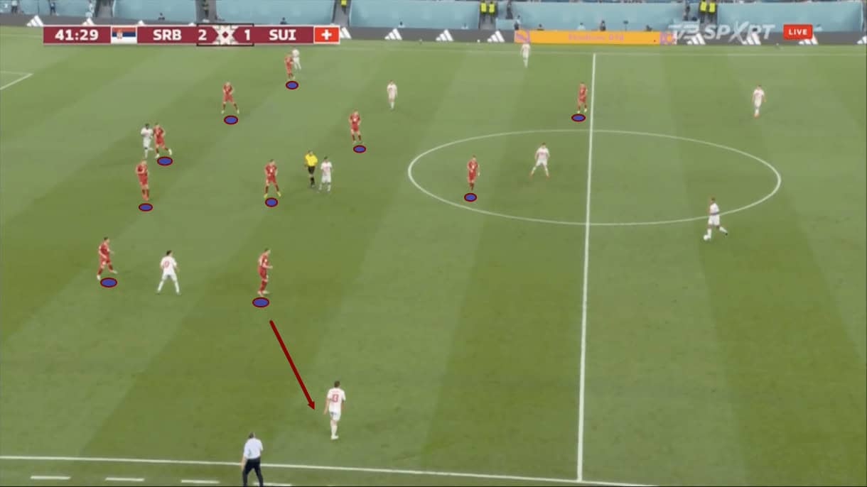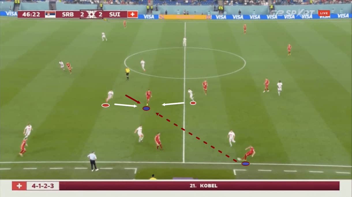 This freed up the Serbian ‘10’ to drop deeper and, crucially, add an extra body to midfield, thus killing Switzerland’s chance creation via the full-backs as now Serbia had easier access to those players and the wing-back was not overloaded.