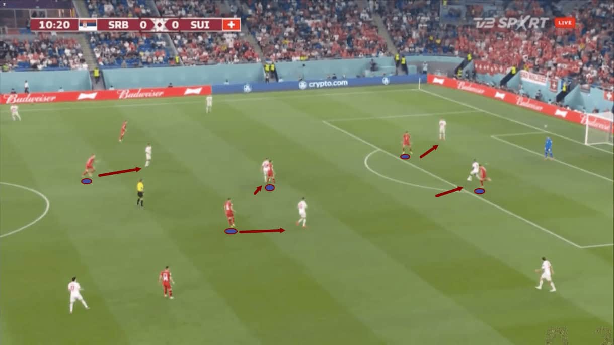 At the same time, the more passive Serbian press resulted in a more compact shape between the lines that was more difficult to pull about. This also, then, made it more difficult for Switzerland to break lines by passing through the centre to Embolo.