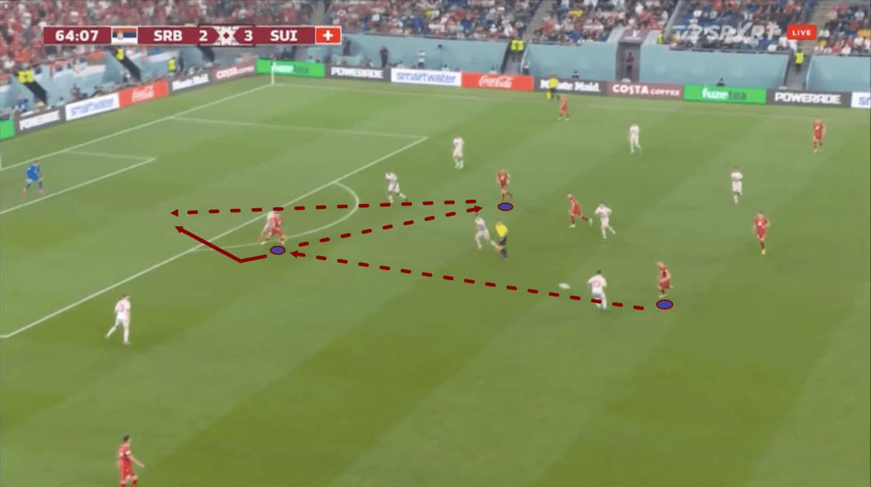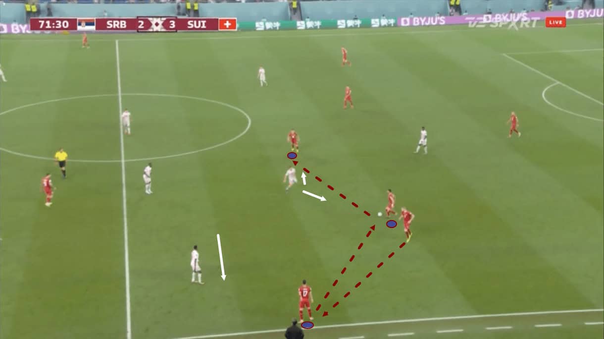 A quick one-two between the full-back and winger, on this occasion, saw the Swiss left-back played into space in the final third, behind Serbia’s left wing-back and left centre-back who was dragged out of position hastily to try and support the overloaded wing-back.