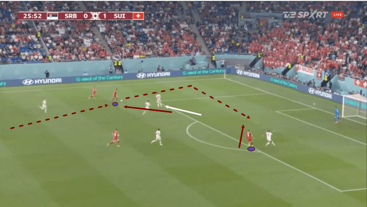 We also notice how one of the two centre-forwards — the one at left-forward — has dropped off a bit from the Swiss backline here. This was another constant in Serbia’s game versus Switzerland. The left forward specifically would drop off to try and occupy space between the lines and either receive here, allowing himself to turn and create facing the backline or drag Switzerland’s right centre-back out with him, then creating space for his strike partner or ‘10’ Tadić to exploit. Mitrović occupied the left-forward position more often than Vlahović but the two strikers rotated responsibilities.