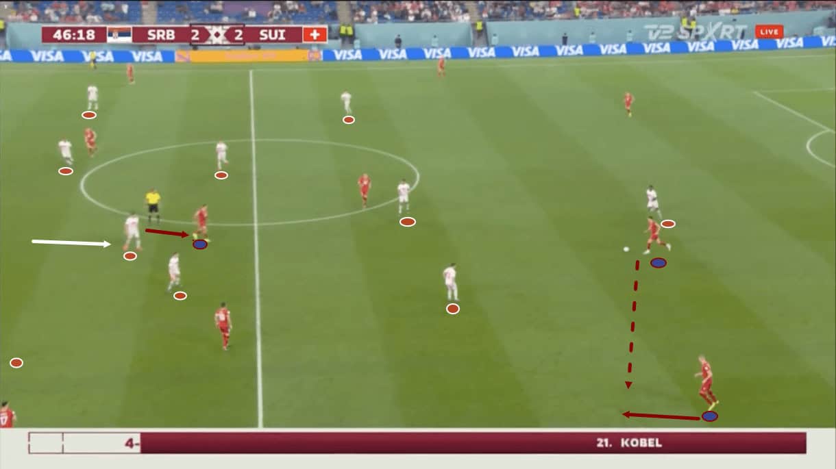 Switzerland created plenty of wide overloads in this fashion throughout Friday’s game and repeatedly used the free full-back as an outlet when the Serbian midfield was all tied up to generate the 2v1 on the wing. Switzerland’s first goal came as a result of these tactics.