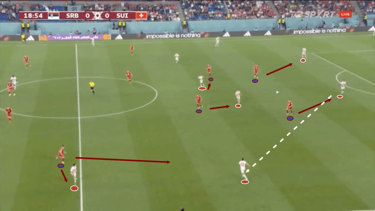 However, where Switzerland thrived in the early portion of this match was with their off-the-ball to drag the Serbian players about, manipulate their positioning and create space for someone to receive and attack the Serbian goal.