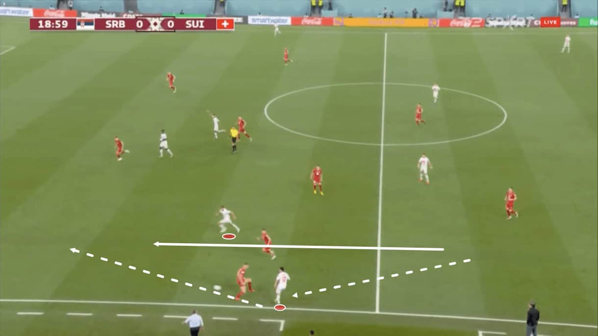 With the Serbian strikers occupied by the Swiss centre-backs, this created plenty of space for Switzerland’s left-back to receive, with Serbia’s right wing-back occupied by both him and Switzerland’s left-winger.