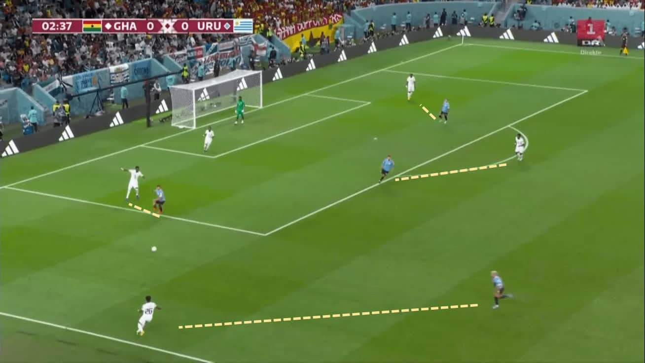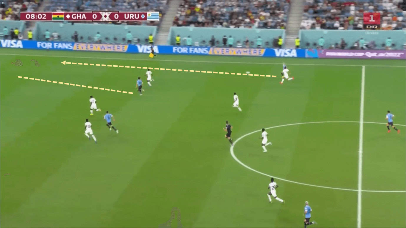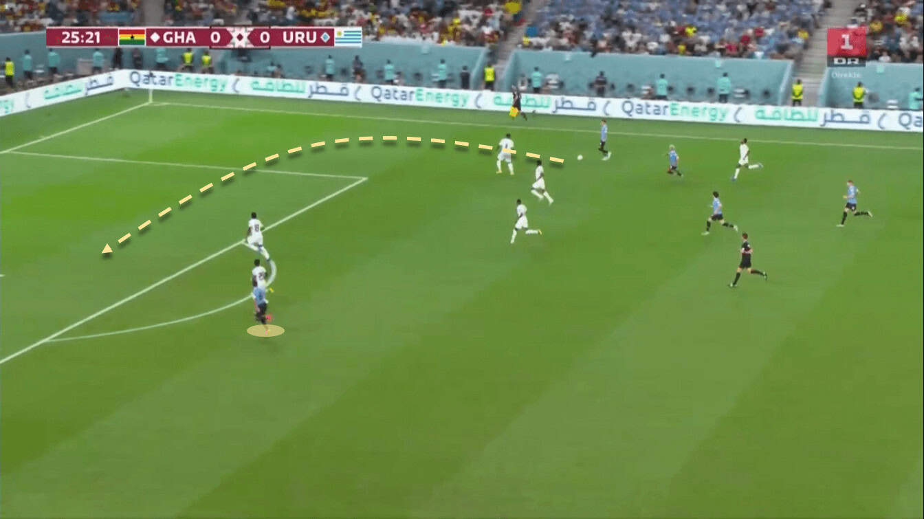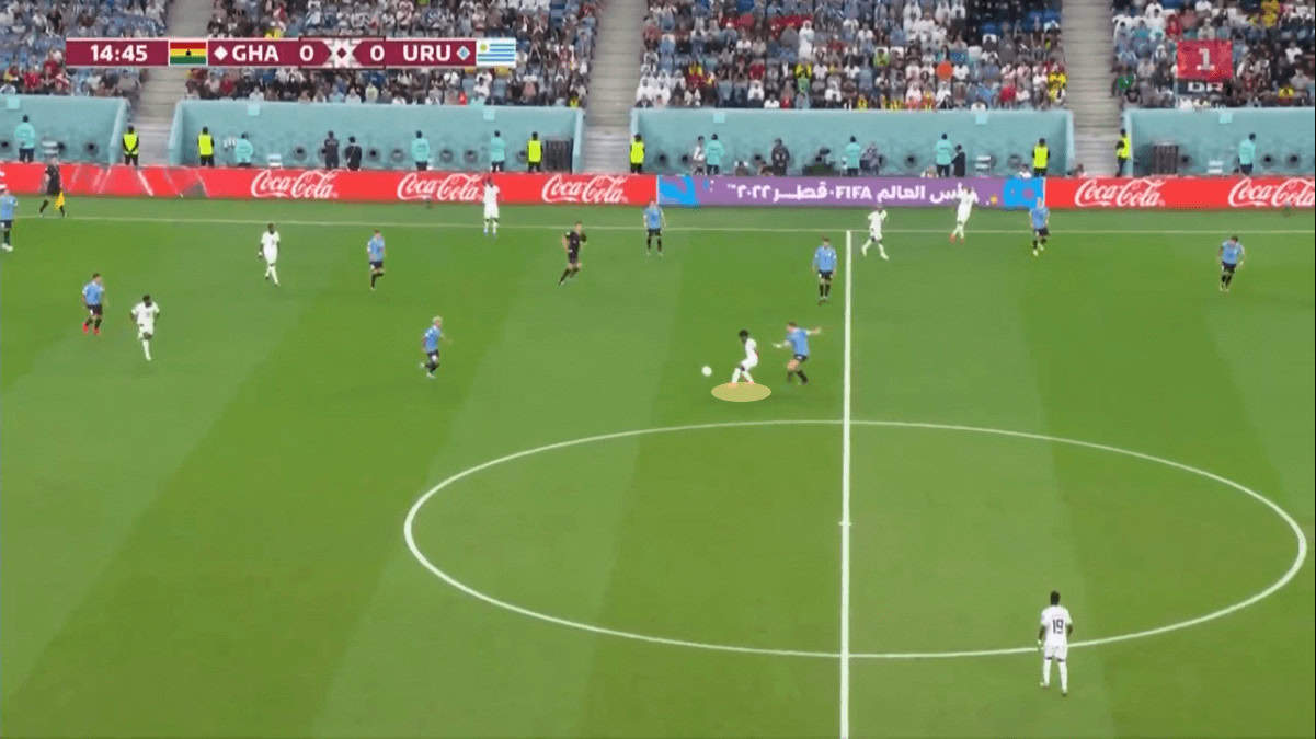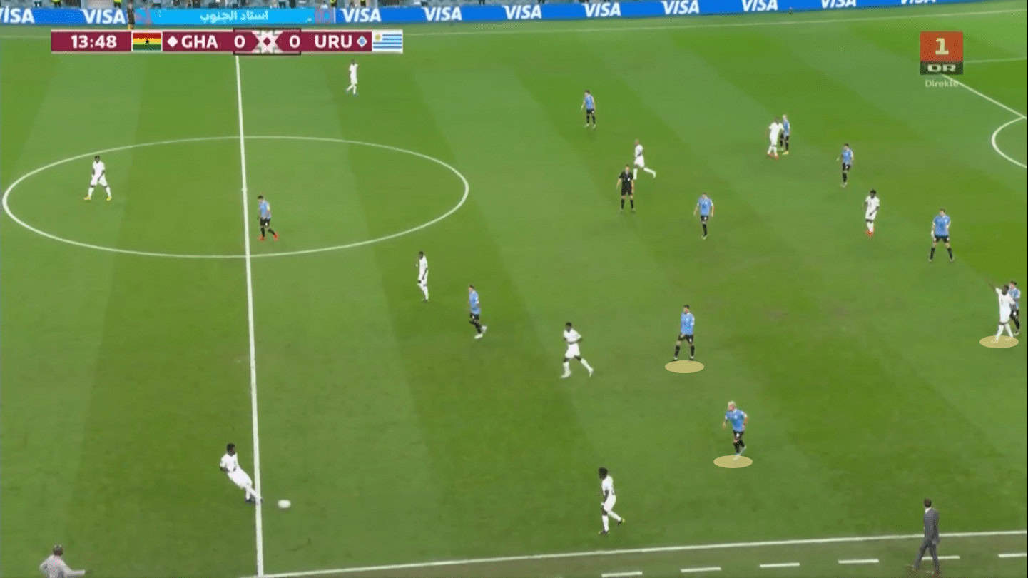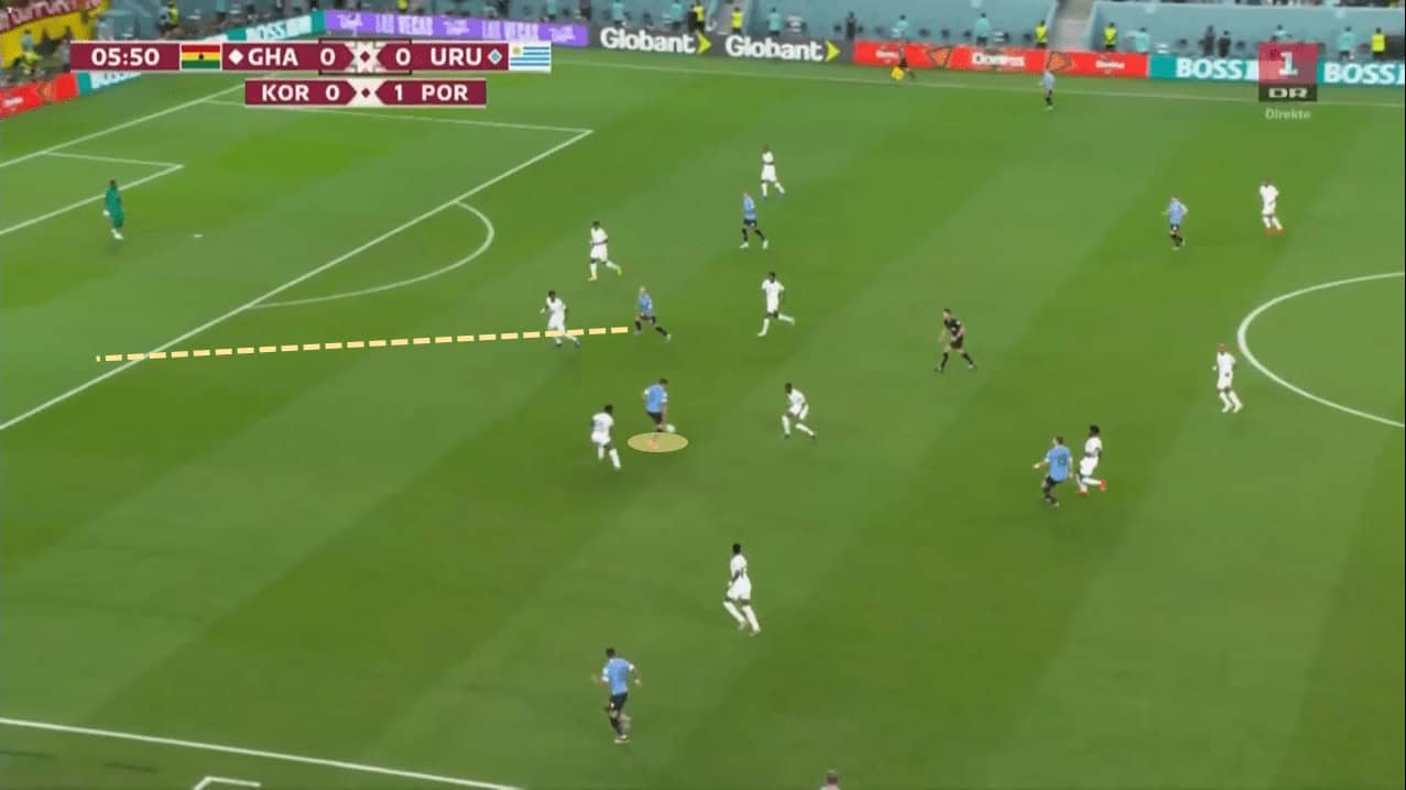 This was a simple but quite successful system for Uruguay that during the whole game did not allow Ghana to connect passes between their front line and the midfielders. In fact, the only way they found to progress, especially in the first half, was from Mohammed Kudus’ receptions and spins. The Ajax player was one of the best players in the group stage, thanks to his scoring contribution but also what he offered in other aspects of the pitch. Neither Iñaki Williams, Jordan nor André Ayew were that active and reading the game that well. The Ayew brothers were even subbed off at half-time because of their poor performance.