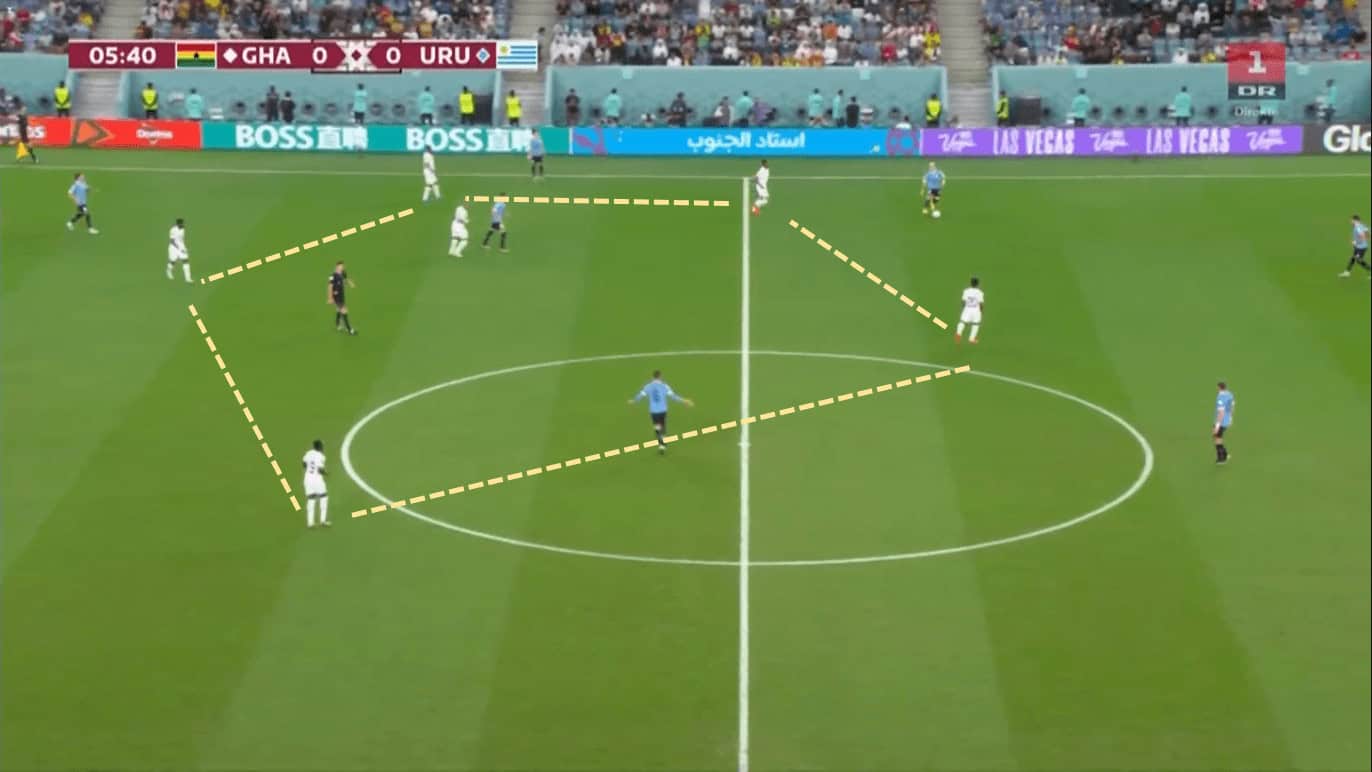 Uruguay first sought to raise their block and position itself in the third of Ghana constantly. The high pressure was clear. Darwin and Suárez pressed the African central defenders close, while Arrascaeta and Pellistri pressed the full-backs, who were far away, exerting the pressure trap there.