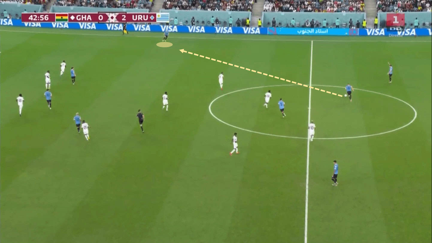 Against Ghana, he did the same thing, and with a more electric Uruguay in the aspect of working passes inside and then receiving outside and throwing into space quickly, he generated a lot with his runs from one side to the other. The role was so dynamic and mobile that he appeared as a winger on the other side of the pitch several times throughout the game.