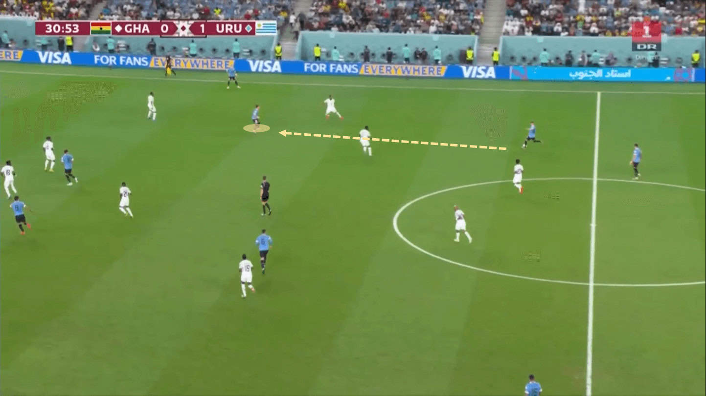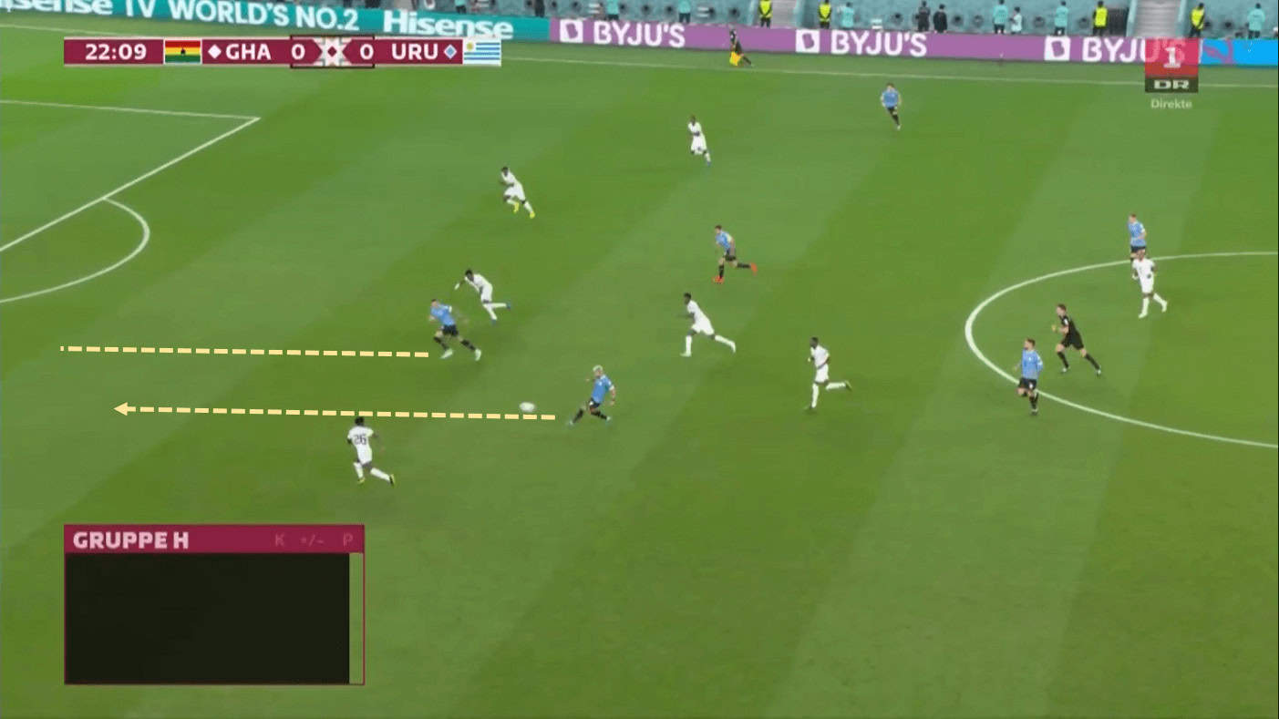 If the ball was played to Ghana’s right side, de Arrascaeta would stay wide pressing the full-back, while Pellistri, the winger on the other side of the pitch, would drop down the middle with Federico Valverde to provide balance and balance there.