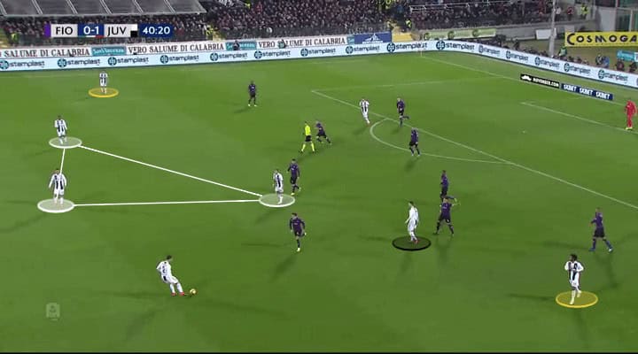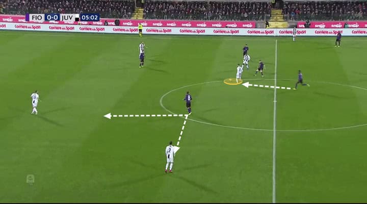 Allegri, as usual, also opted for a man-orientated pressing scheme. Juve’s front-three was perfectly suited to press Fiorentina’s situational back-three when building up (right-back Nikola Milenkovic acted as a right-sided centre-back in possession). Juve removed easy options and caused Fiorentina to struggle when playing out from the back. Normally La Viola do this well but Juve made it difficult for them. As you see below, Juve also committed players when pressing high.