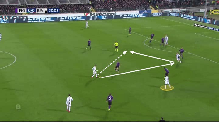 The formation change allowed the outer centre-backs Chiellini and De Sciglio to step forward more with the ball and create problems for Fiorentina’s midfield. We can see the attacking setup below with Cuadrado and Cancelo wide. De Sciglio has moved forward and attracts pressure while Juve maintains plenty of central options to create numerical advantages in the central areas. Ronaldo (black) often dropped into the space between the lines from where he picked up the ball in good areas and forced Fiorentina’s midfielders to worry about yet another player.