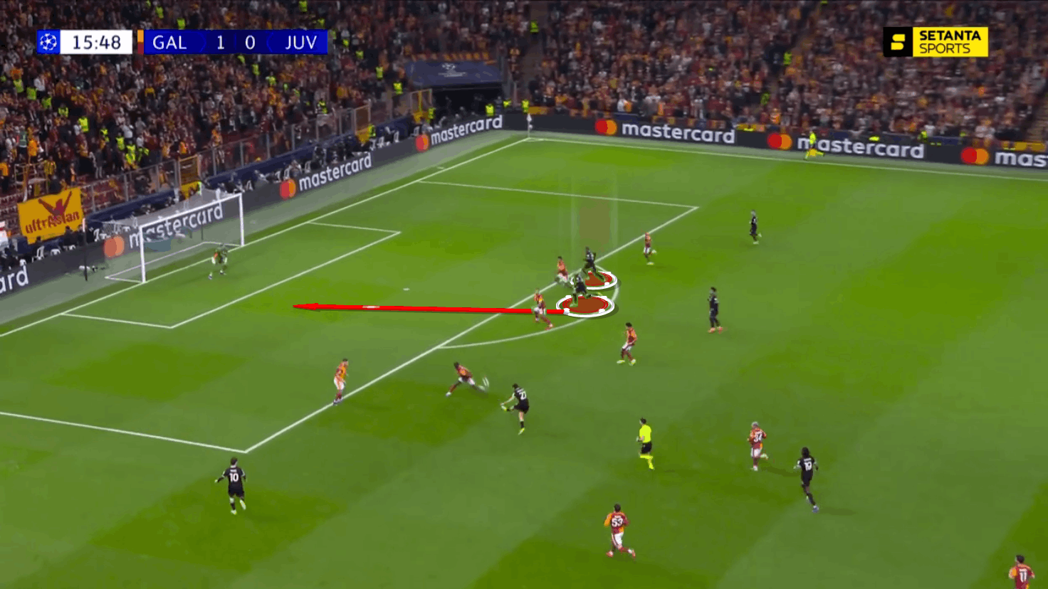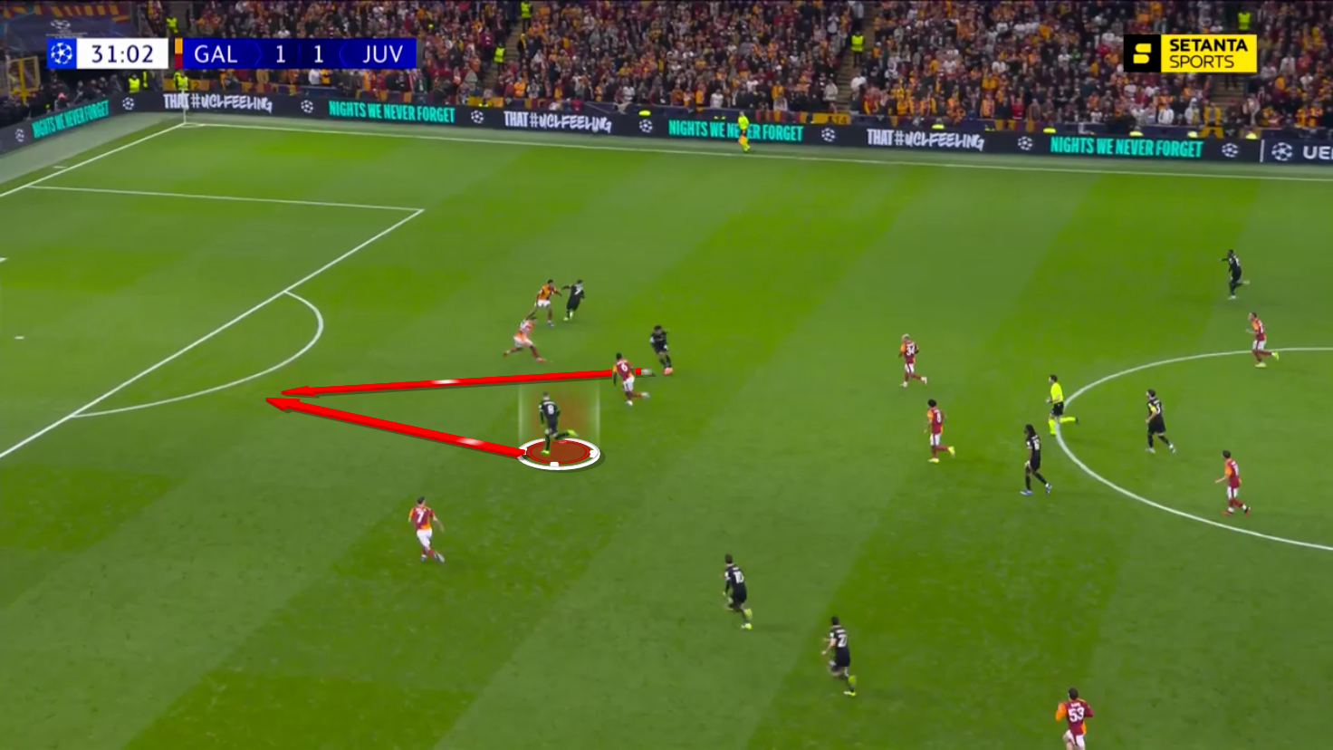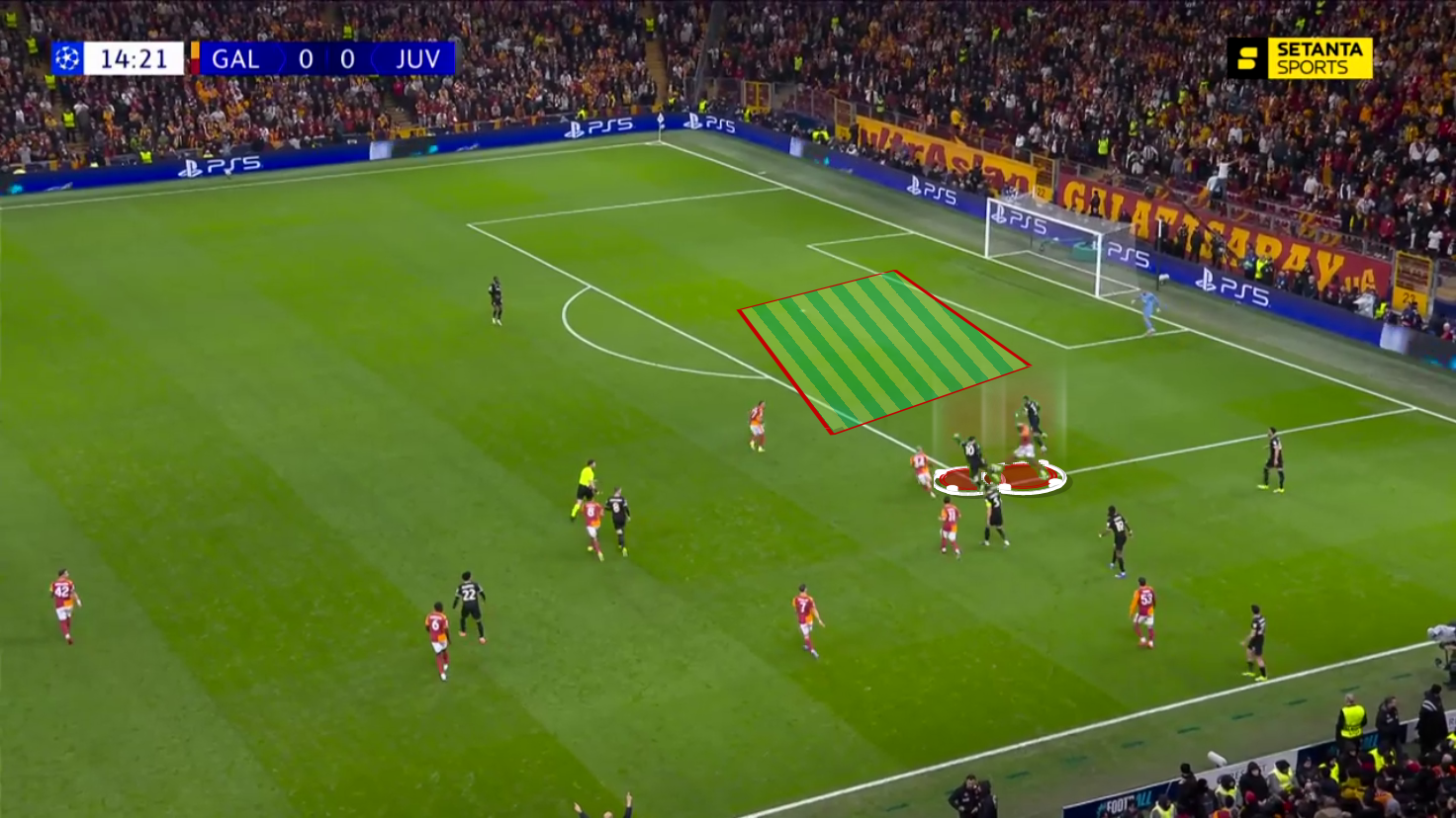 This was crucial in allowing Galatasaray to create space in front of Juventus’ goal, which allowed Sara to score from distance after winning a second ball following Lang’s poor handling of the situation.