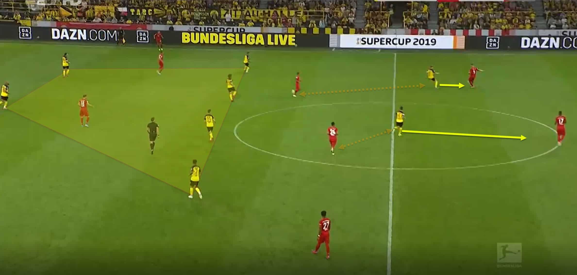 In our first ‘competitive’ taste of German football this season, it was once again Borussia Dortmund and Bayern Munich in the German Super Cup. Both sides were looking to make a statement regarding the Bundesliga, and while both sides certainly made a statement, it was Borussia Dortmund who made the positive one, with an impressive 2-0 victory. Bayern seemed to experience their familiar problems, while Lucien Favre’s flexible approach got the better of Niko Kovac and his team. In this tactical analysis, I’ll look at Dortmund’s approach to the game, and also highlight Bayern’s problems, both defensively and offensively.