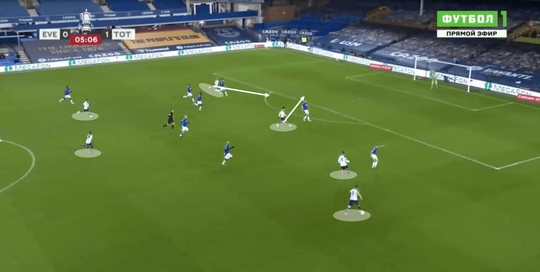In the image below, however, it is the opposite that causes Everton some issues, as they attempted to apply a press, albeit a poor attempt, and Spurs – again through Bergwijn, were able to create another dangerous situation.