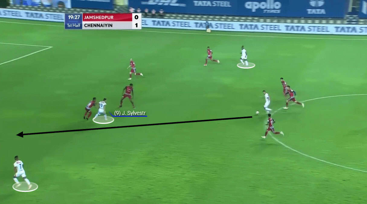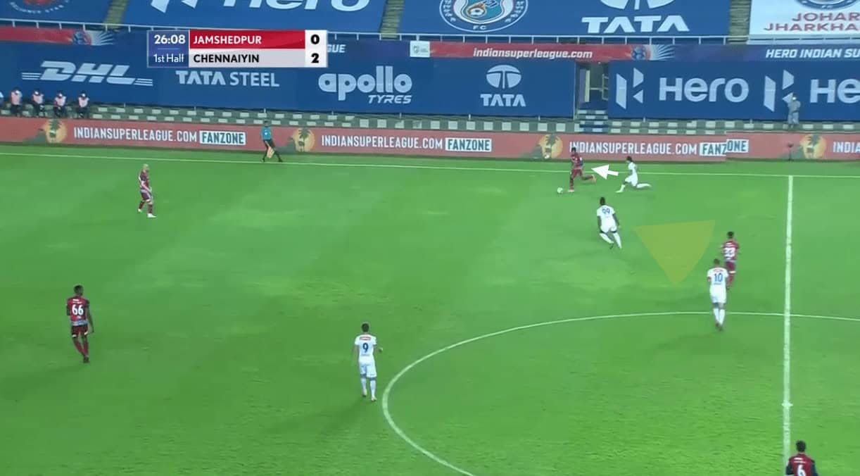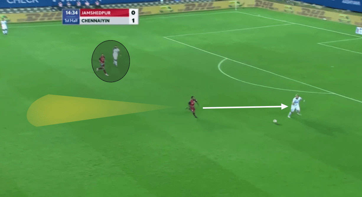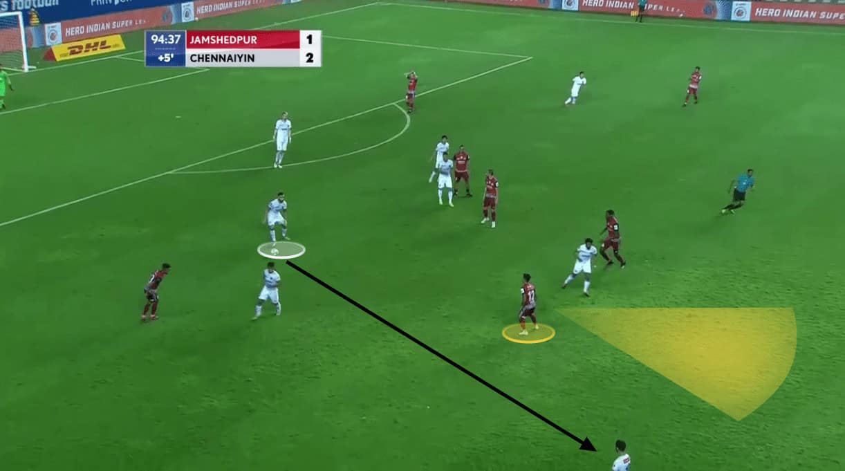 In the above instance, you could again see Lima on the wide left. Lima’s movement did drag away Tangri from his position but the Chennaiyin midfielder recovered back in time when the ball was switched from the left to right (from Jamshedpur’s perspective).