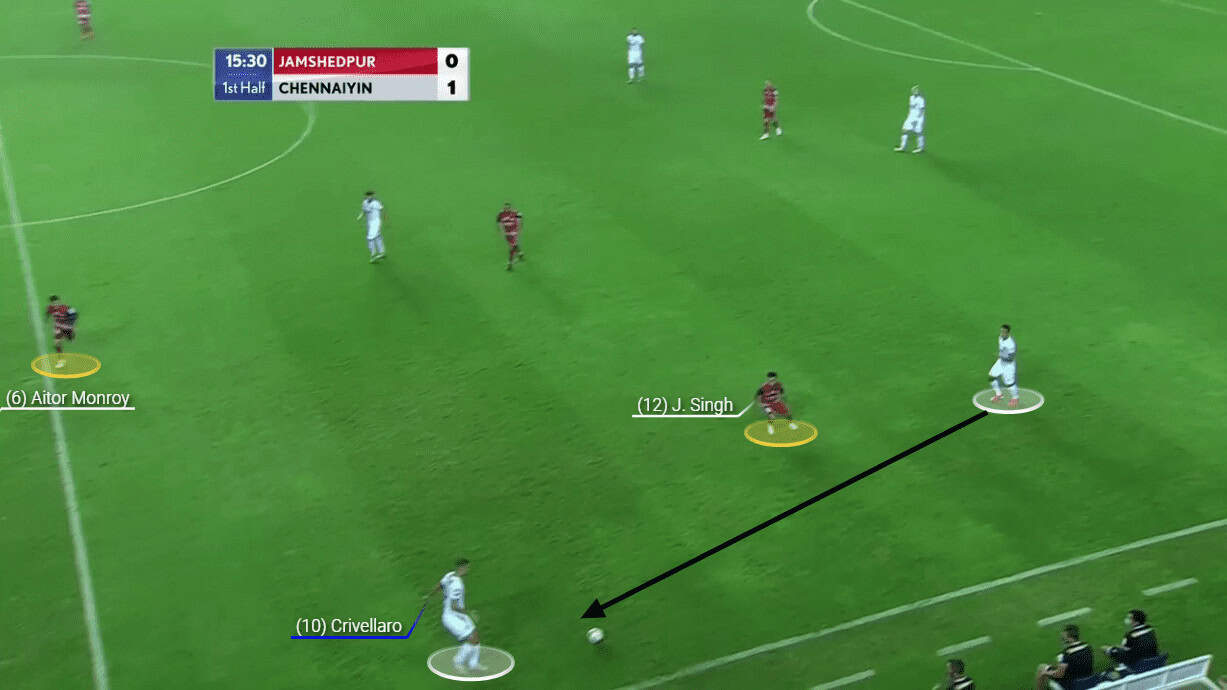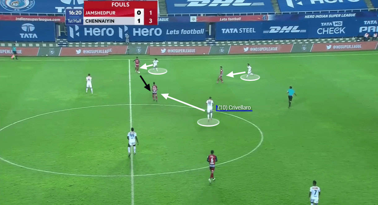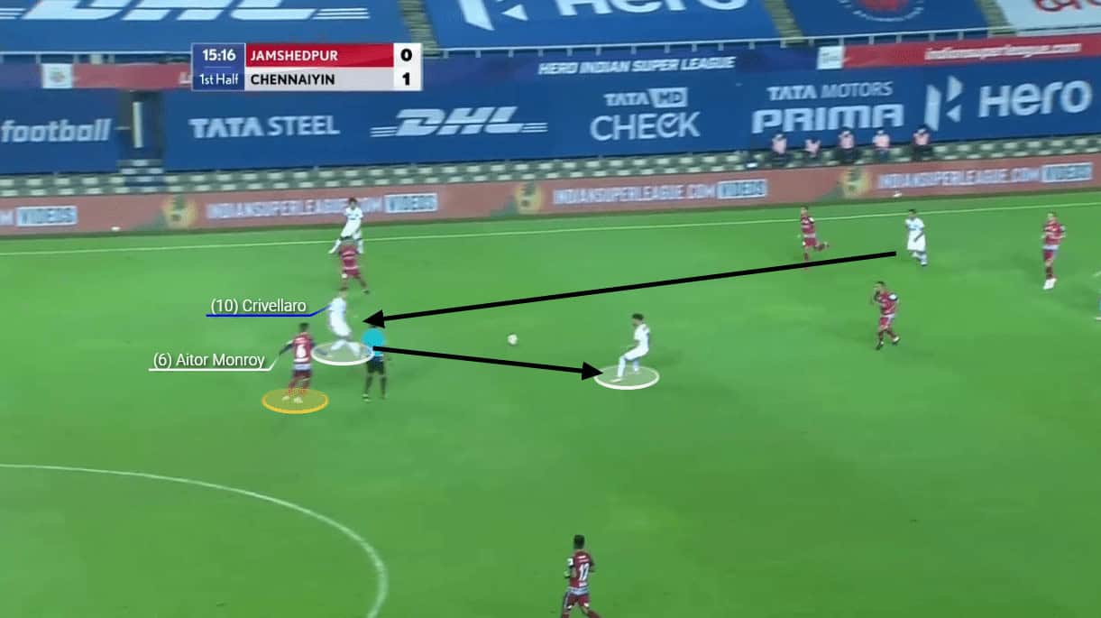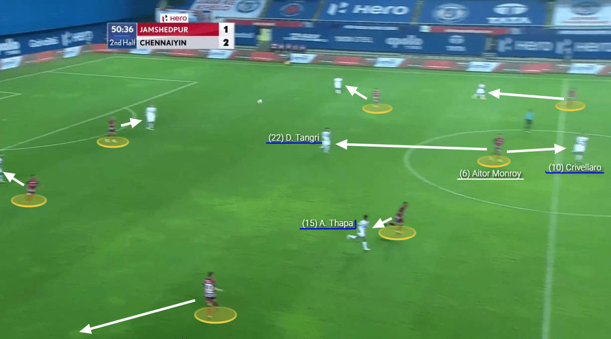 Chennaiyin troubled Jamshedpur with their counter-attacks mainly. However, the only way Chennaiyin troubled Jamshedpur in their first and second phase of build-up was through Crivellaro creating an overload on certain players. Here, as you can see, Crivellaro dropped deep and created an overload on Monroy along with Tangri and helped in the build-up.