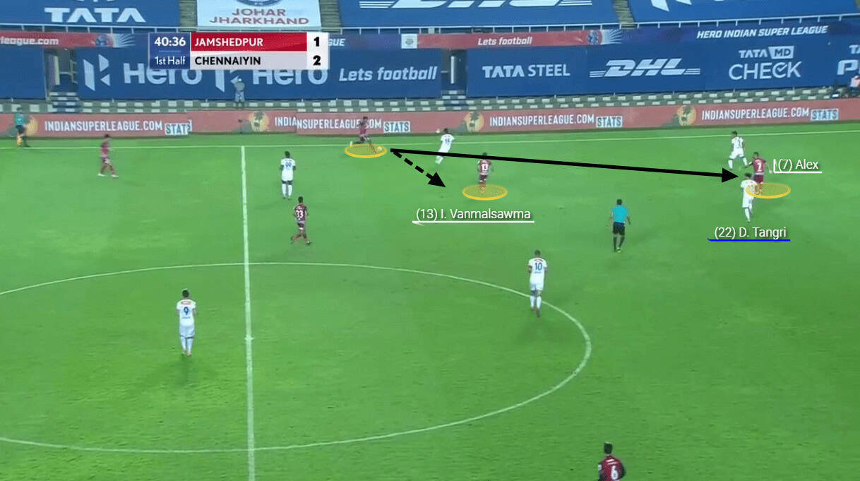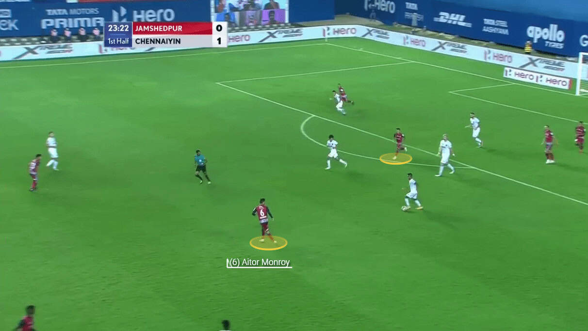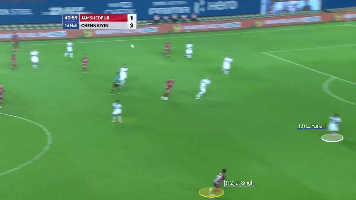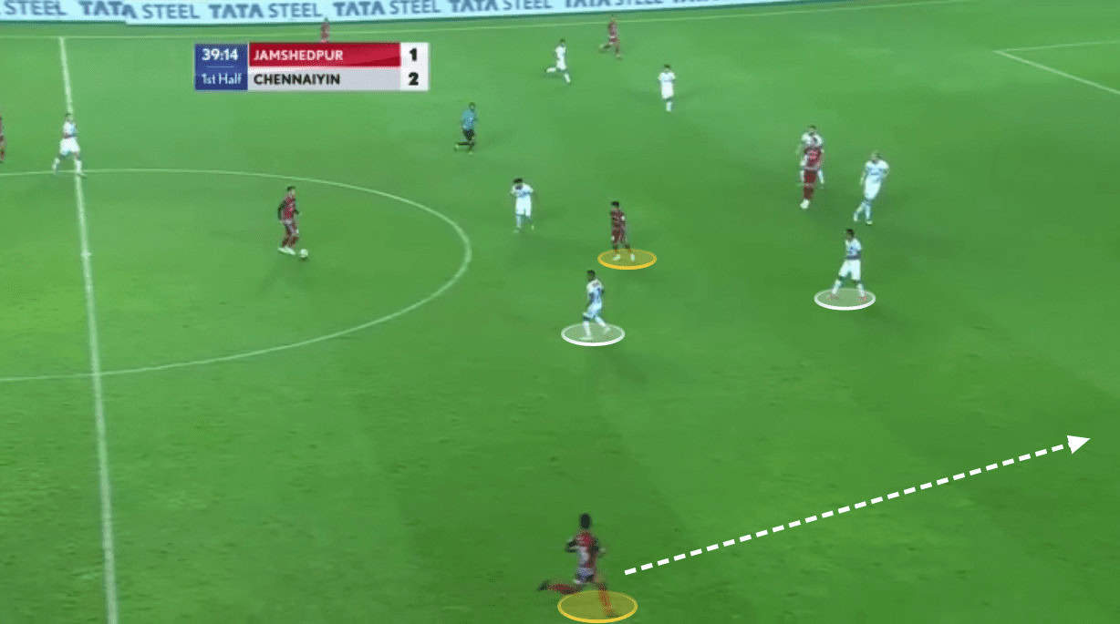 The ball was circulated on the left flank (from Jamshedpur’s perspective) dragging the Chennaiyin unit towards their right leaving the left flank (from Chennaiyin’s perspective) exposed. Jamshedpur took the help of Monroy to switch the channel. Jackichand’s positioning engaged both Chhangte and Fanai in this instance. Renthlei tried to exploit the situation by making a marauding run but Monroy’s passive passing did not help Jamshedpur’s cause.