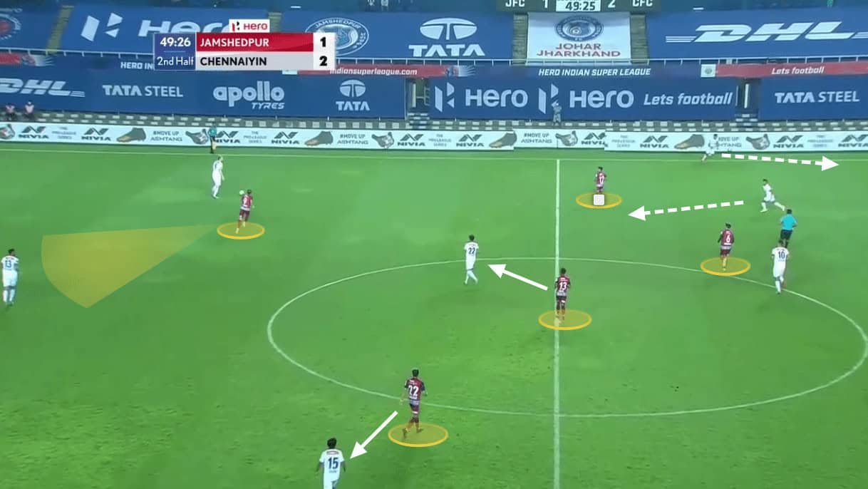 Chennaiyin hardly built-up from the back but on a few occasions when the Marina Machans did build-up from the back, Jamshedpur pressed them high. The pressing structure was mainly man-oriented with the striker, Valskis, and the CAM, Lima pressed the two Chennaiyin centre-backs. Lima initially positioned nearer to the opposition pivot but when one Chennaiyin centre-back passed the ball to another, the pressing was triggered and Lima quickly moved up to aggressively press the centre-back keeping the pivot in the cover shadow as well as forcing the build-up towards the flanks.
