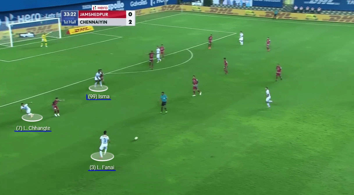 As can be seen in the above image, Isma positions himself behind the left-back, and Sylvestr pins the right-back. Sylvestr’s positioning helps in creating an overload on the right-back along with Chhangte. Crivellaro finds the left-winger in a lot of space. This situation could have resulted in a goal for Chennaiyin if not for Rehenesh’s save.