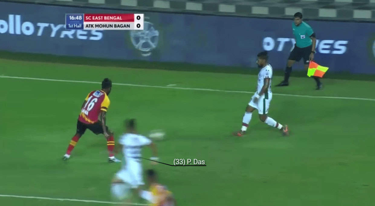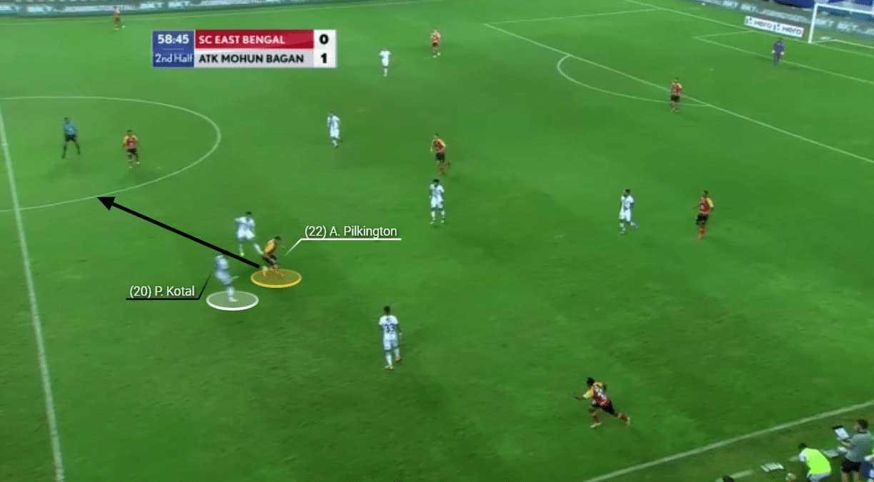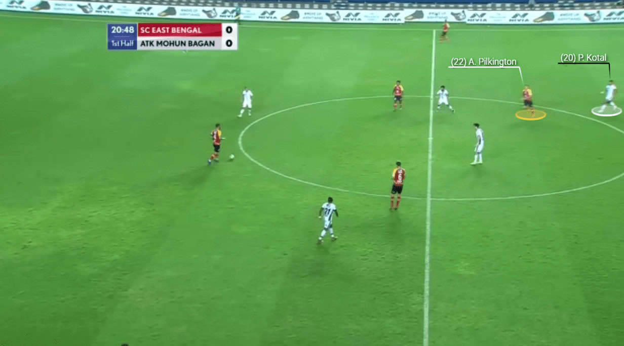 The left half space and the space between the second line of press and the last line of press was protected by Jhingan. However, the right half space and its space in between the lines wasn’t protected, as Pritam Kotal wasn’t interested in following Pilkington when he dropped deeper. Pilkington tried to take advantage of it by positioning himself in the right half space (from East Bengal’s perspective) in between the lines.