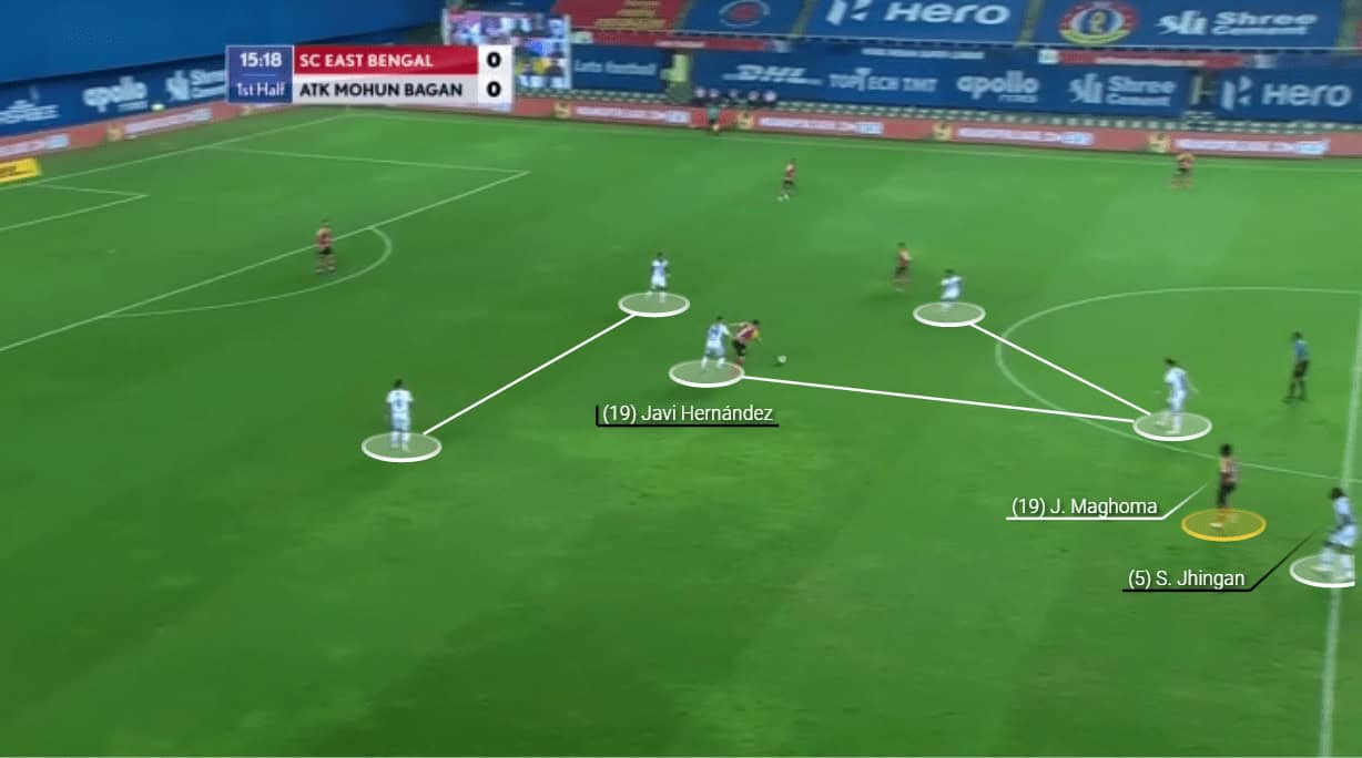 The other aspect of their pressing structure was that whenever Maghoma used to drop deep, Sandesh Jhingan followed him until and unless Maghoma stepped into any other ATKMB player’s zone.
