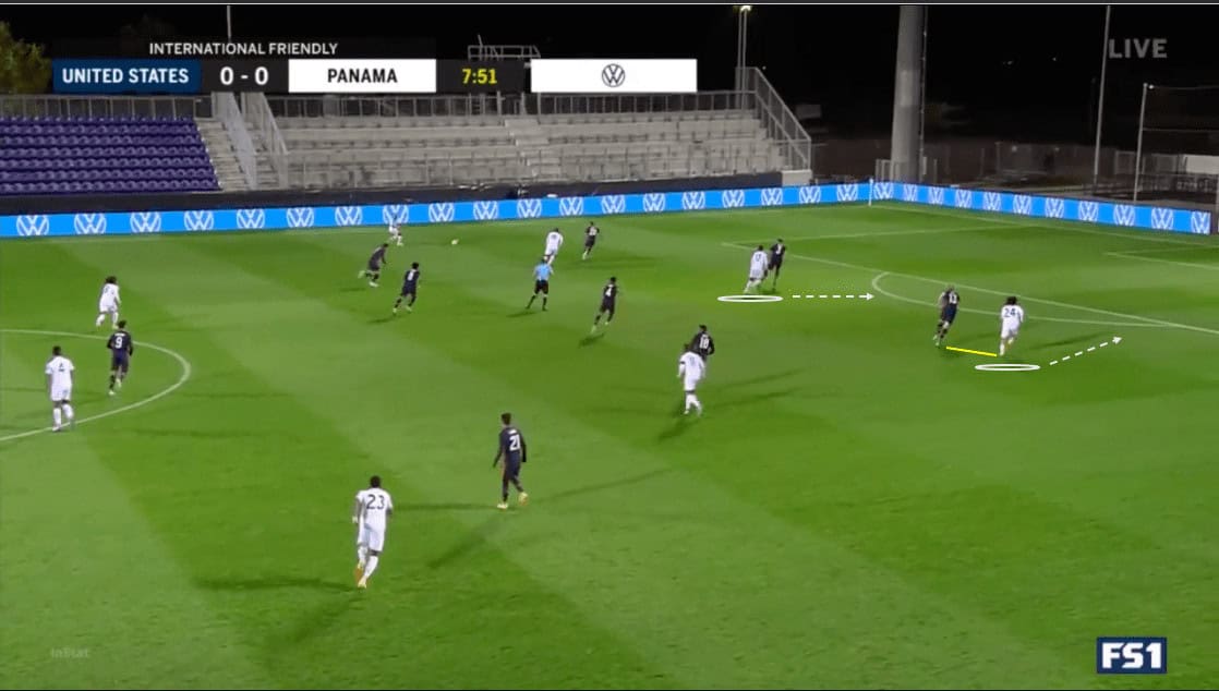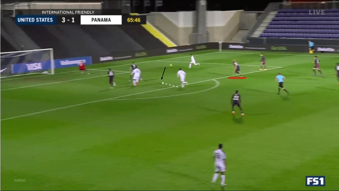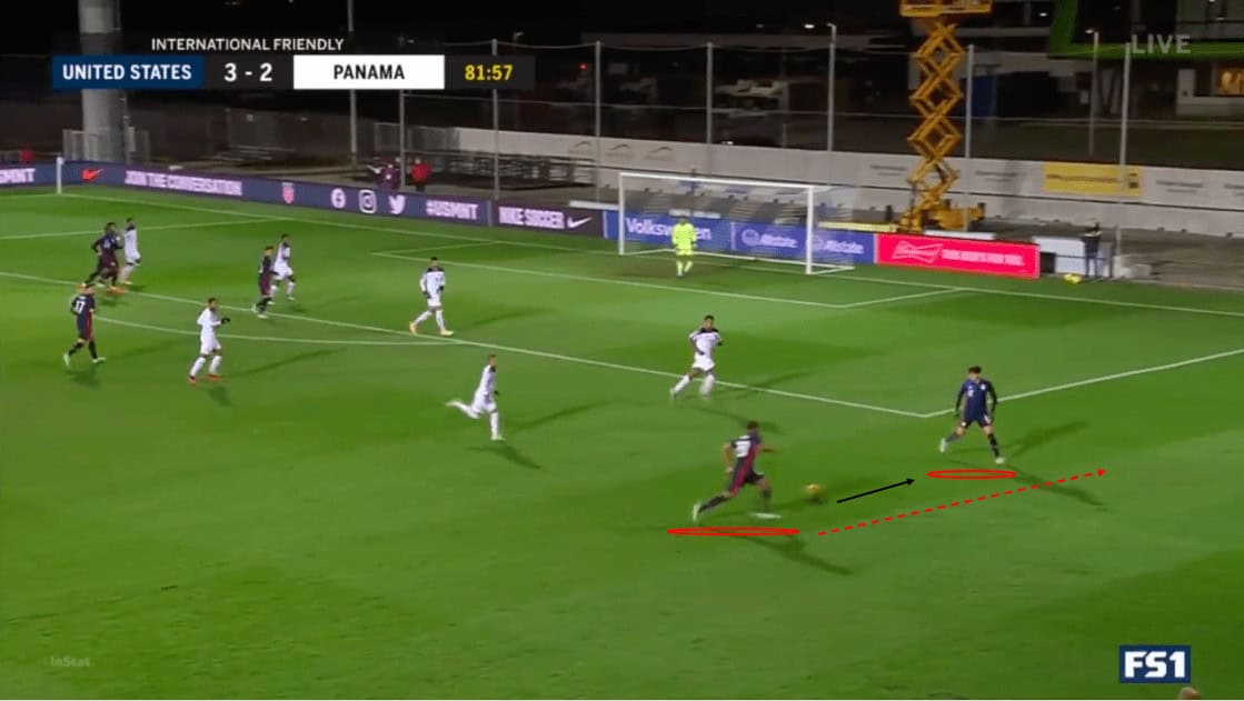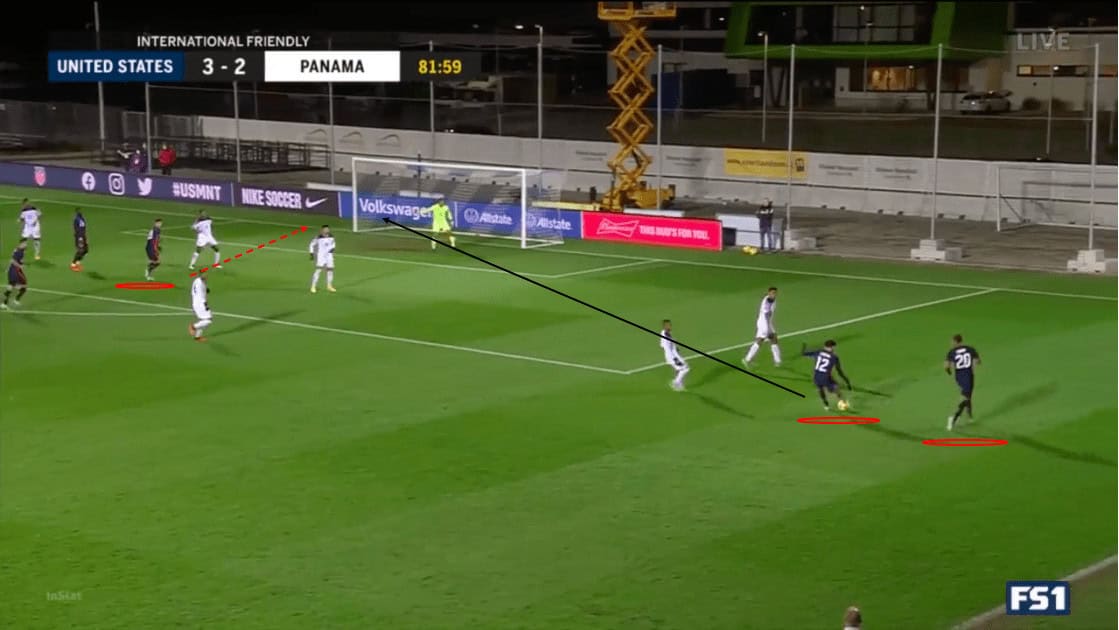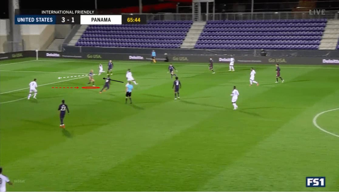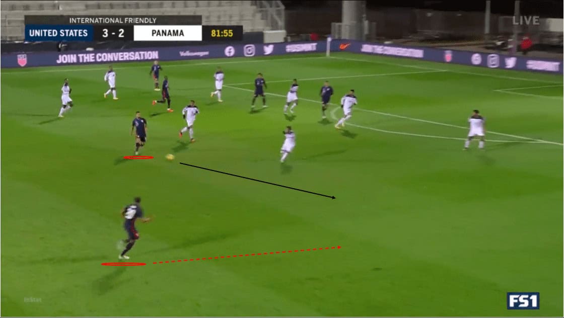 In the second half, we see an example of numerical overloads creating superiority on the opponent’s weak side. We see that Lletget is preparing to pass to Cannon, who is making a run into space. The Americans’ build up on the left has drawn the Panamanians across the field, creating space for Cannon and Ledezma on the right.