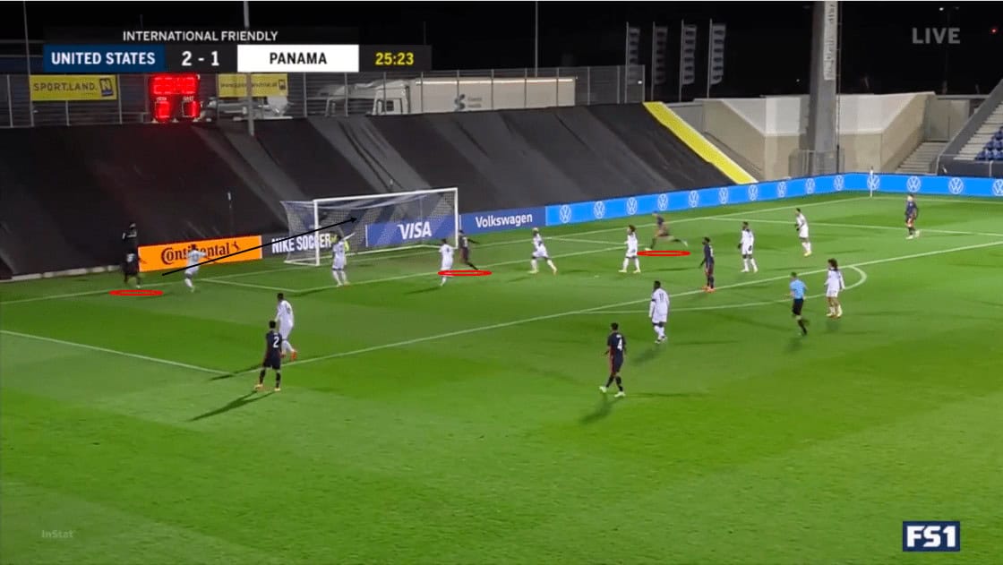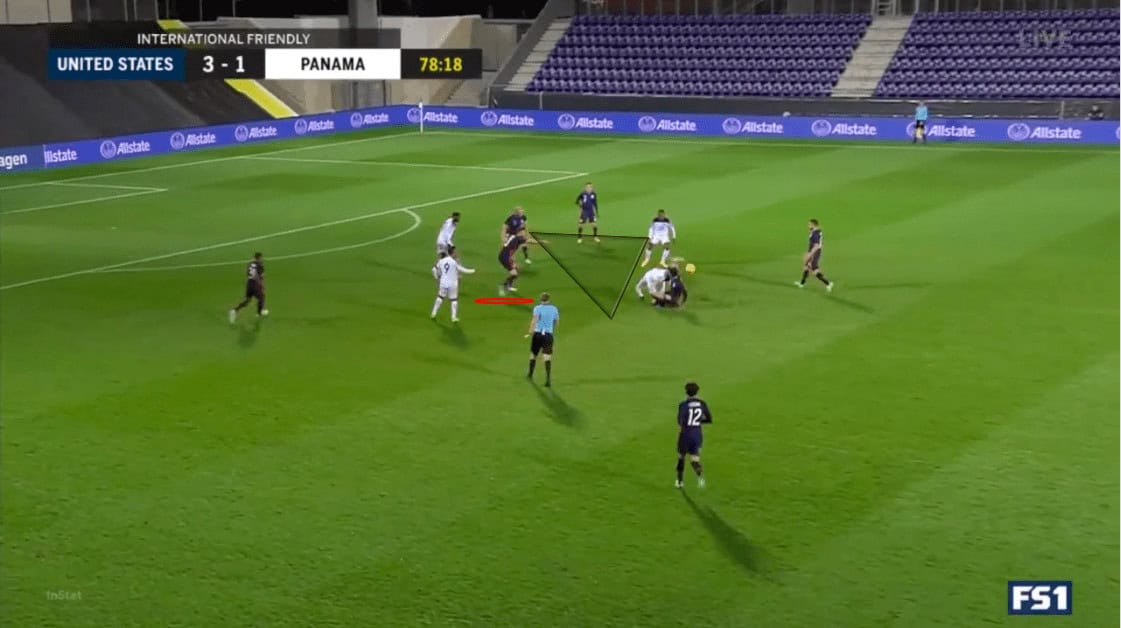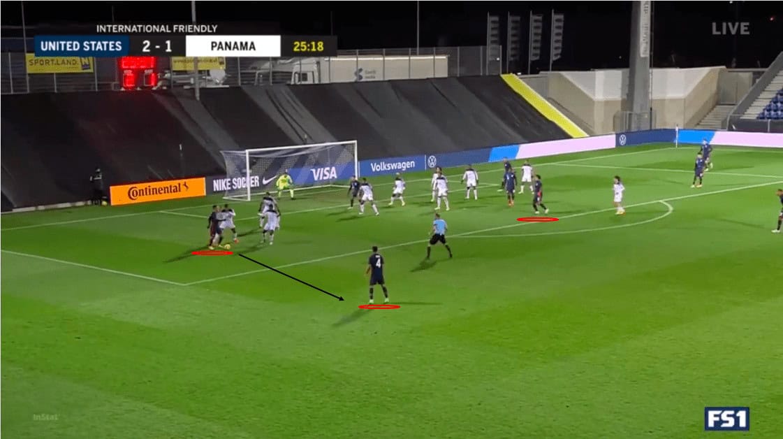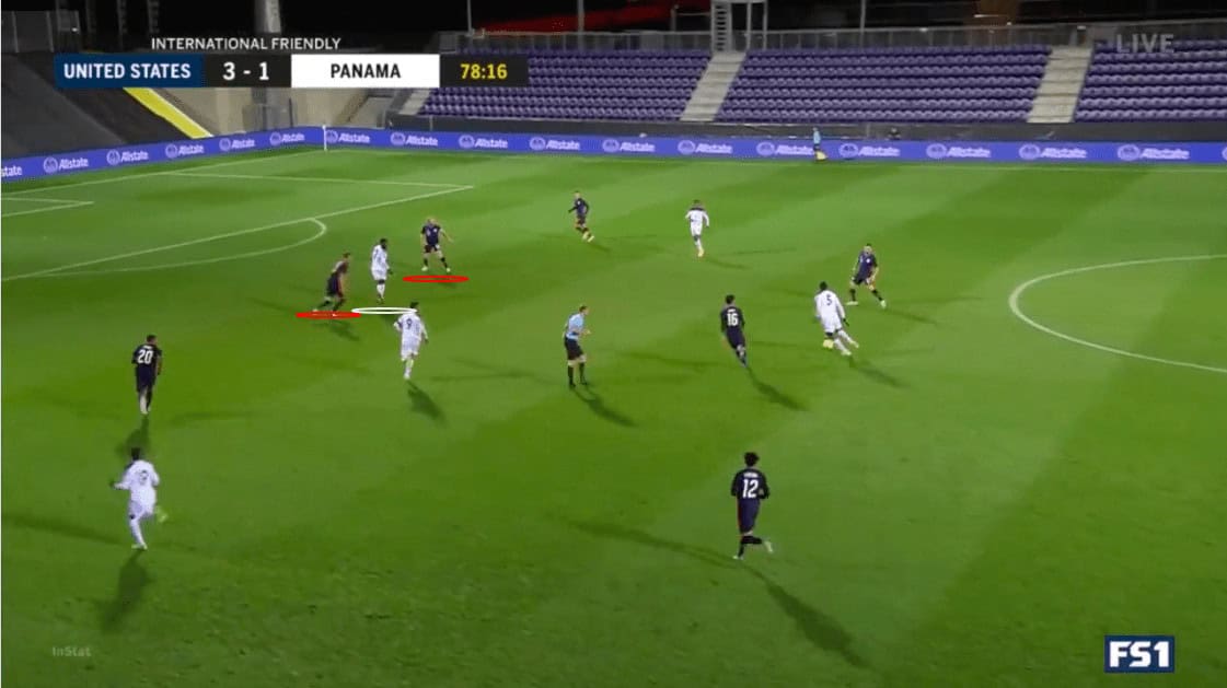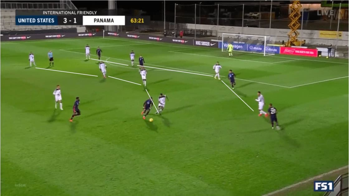 This problem also extended to their middle block. The Panamanian defensive lines were disconnected, allowing the Americans to play through them at will. Using the example above, we can see that they are maintaining their defensive shape. However, the spacing between the lines and the defenders allows Ream to skip the midfield line to his intended target.