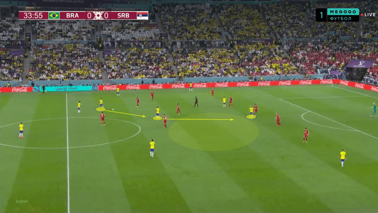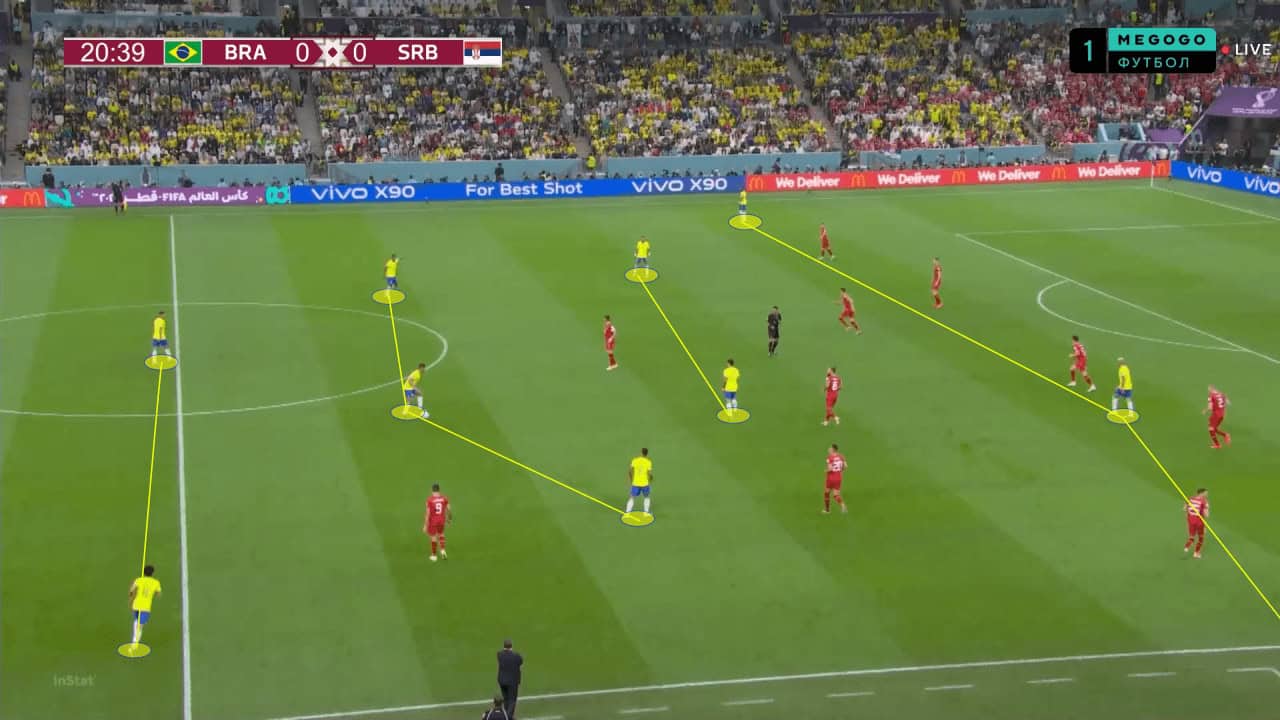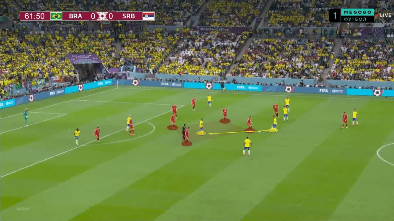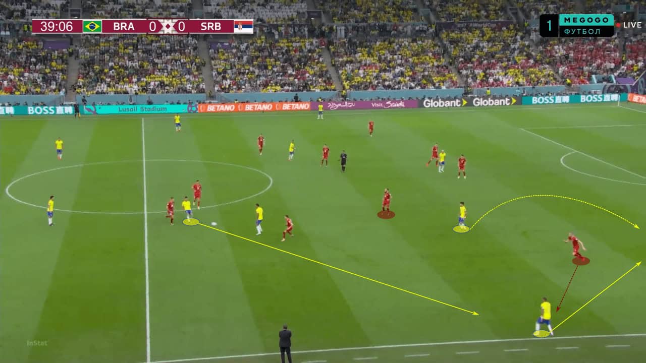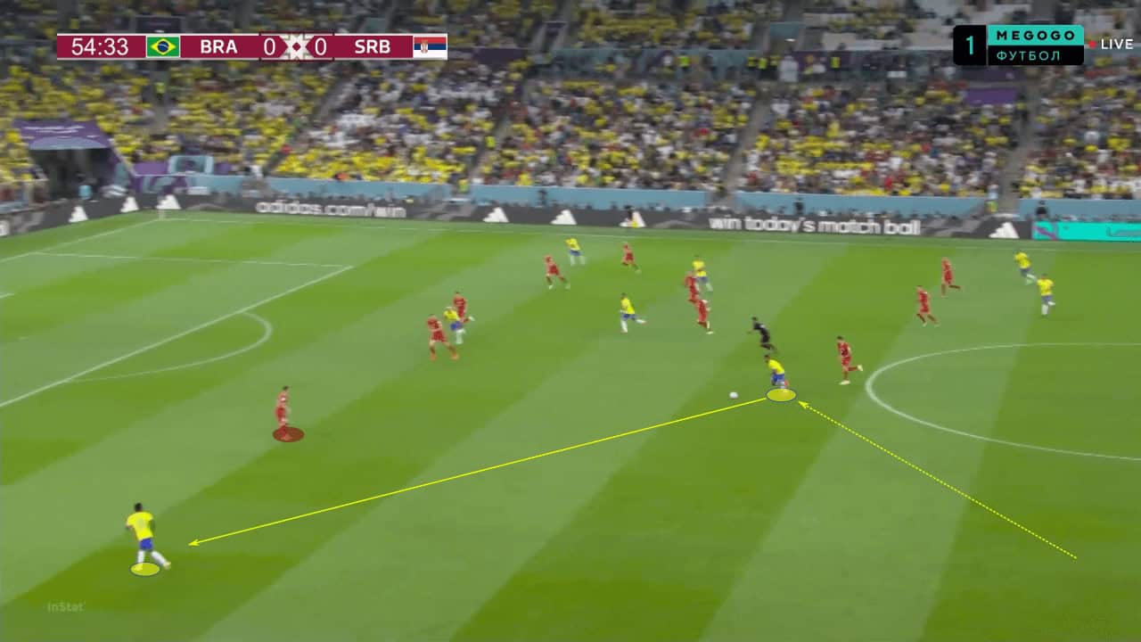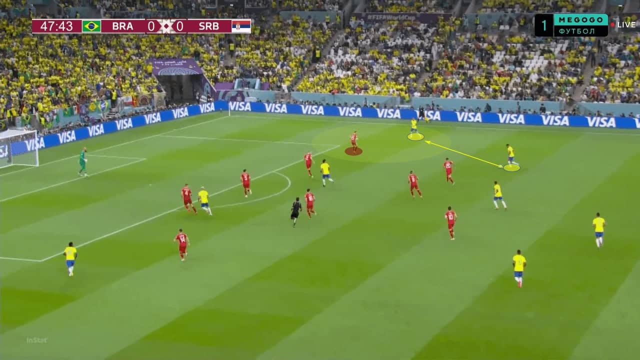 These solutions take us to Brazil’s two goals, which came after the hour mark. In the first, Casemiro is able to find Neymar in a gap inside Serbia’s low block. The superstar’s individuality allows him to get away from the defenders and reach Vini on the left, who has a first-time shot at the opposite corner. Richarlison is then able to put it in the back of the net after the keeper saves it.