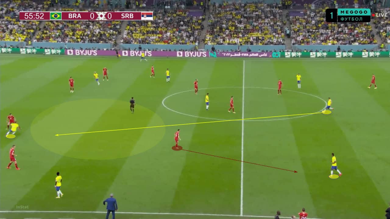 One of the main objectives of the inverted full-backs was to create 1v1 scenarios in wide channels. By leaving Vini and Raphinha isolated on the wings, they were often left alone with Serbia’s wing-backs. Considering the quality of these wingers, these scenarios are extremely favourable. This can be illustrated in the image below. As Danilo drives forward in the right half-space, he plays Raphinha wide who is 1v1 against Mladenović.