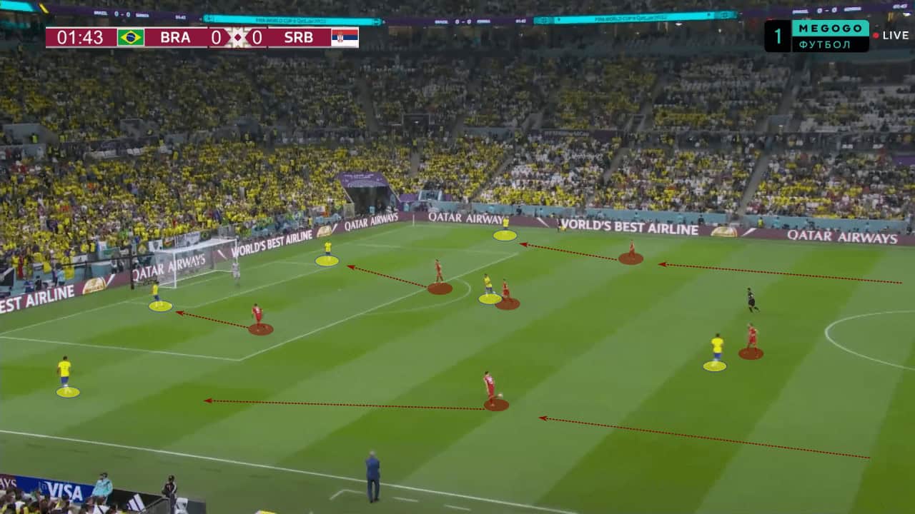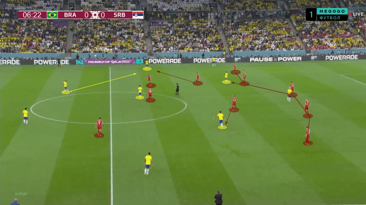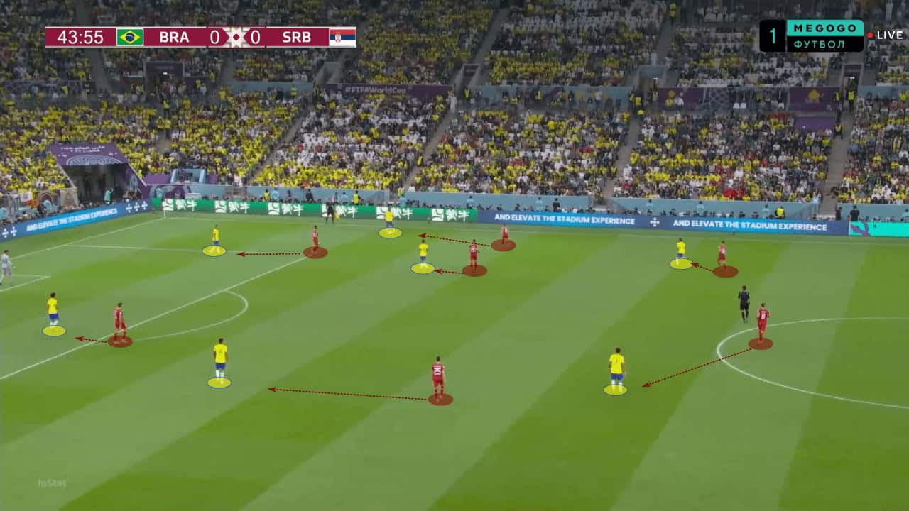 In addition to exploring and identifying how Stojković’s defensive system caused Brazil trouble, this analysis will also look at how Brazil were able to assume control of the match and find the answers to Serbia’s puzzle.