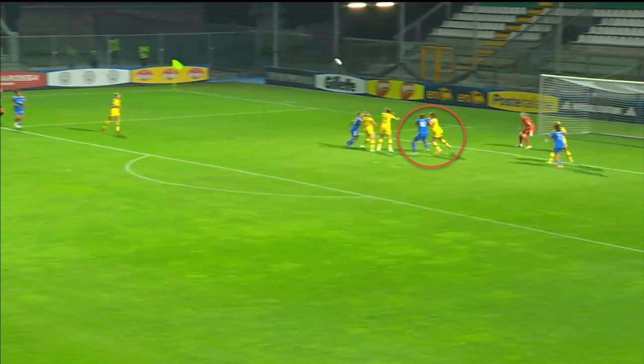 Indeed, this possession wasn’t always exploited in the needed way, yet some good signs were seen in this match, such as the ability to create numerous chances and reach the goal very often. This performance lacked the inability to concretise the created chances due to precipitation at times and lack of accuracy at other times. This is an example of wrong shooting decisions since Giacinti hurried to shoot without checking to see if there was a better-positioned player than herself during this action.