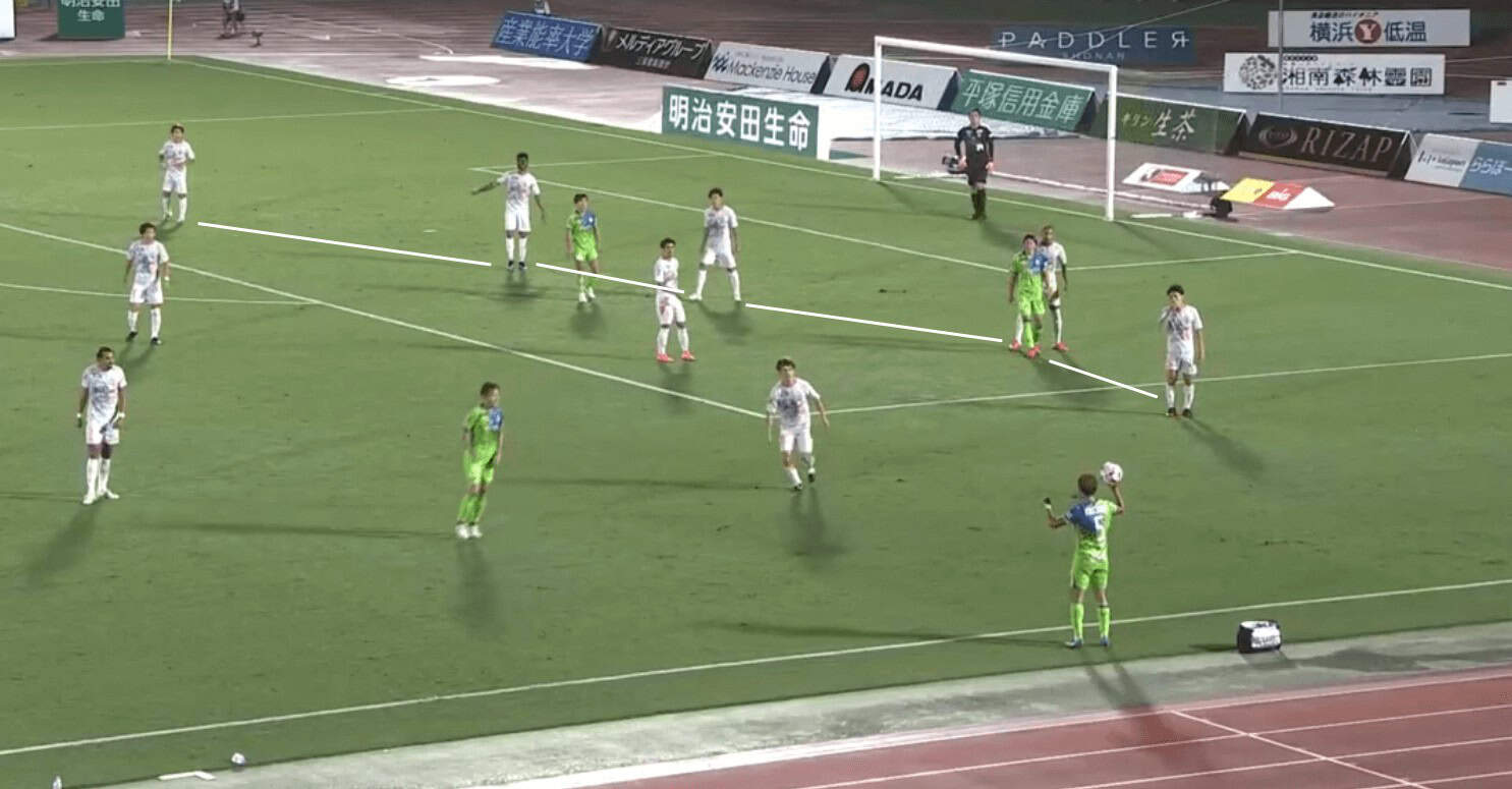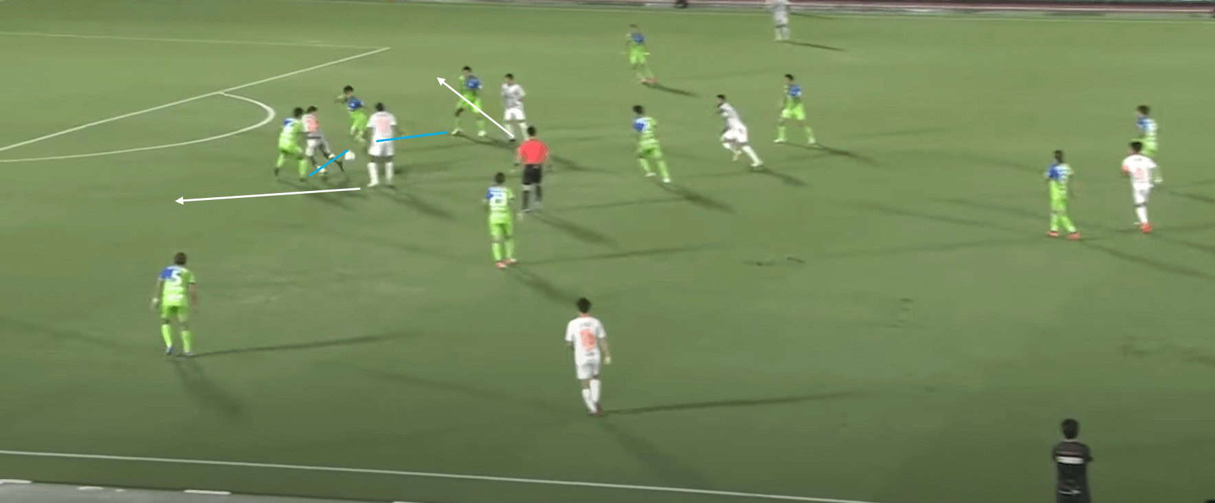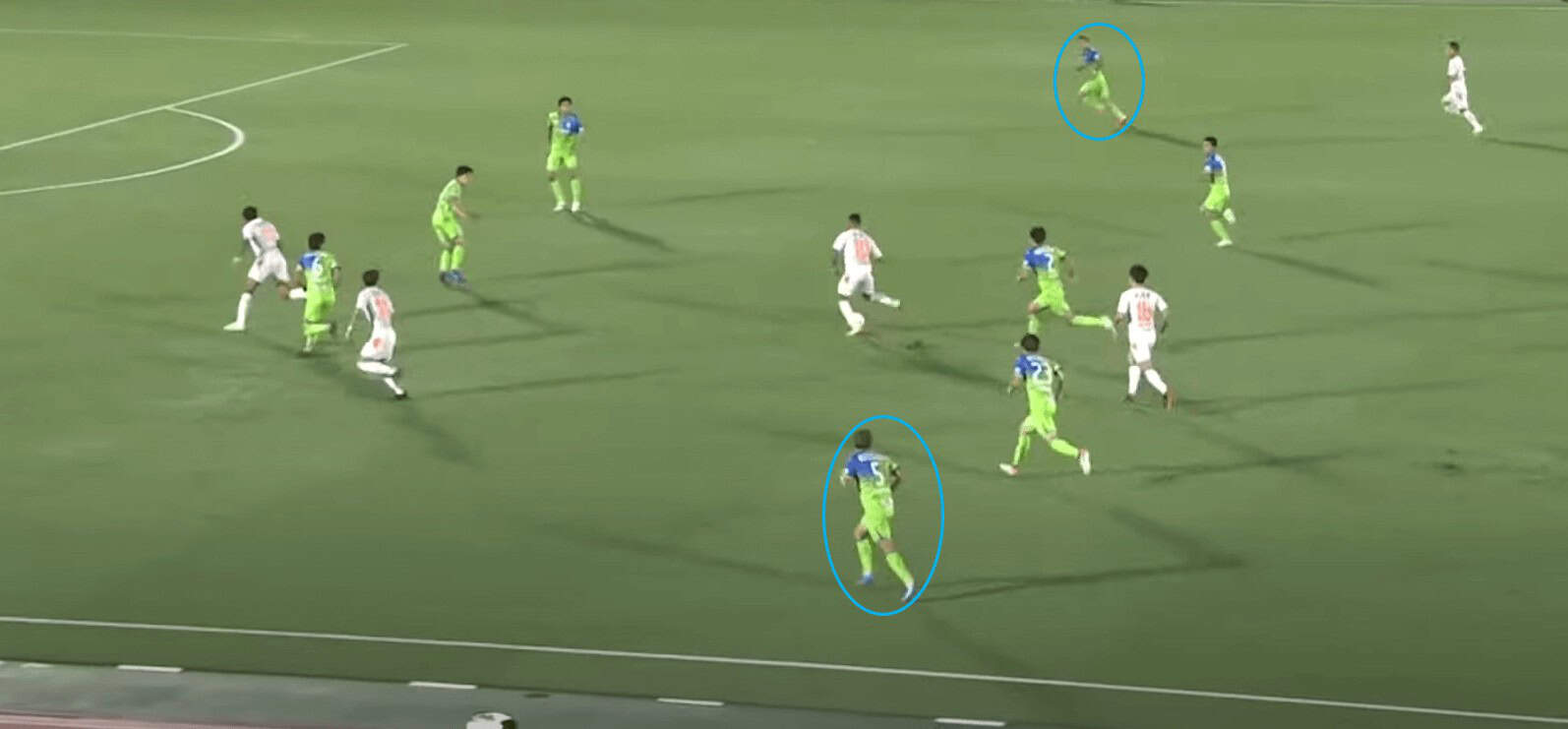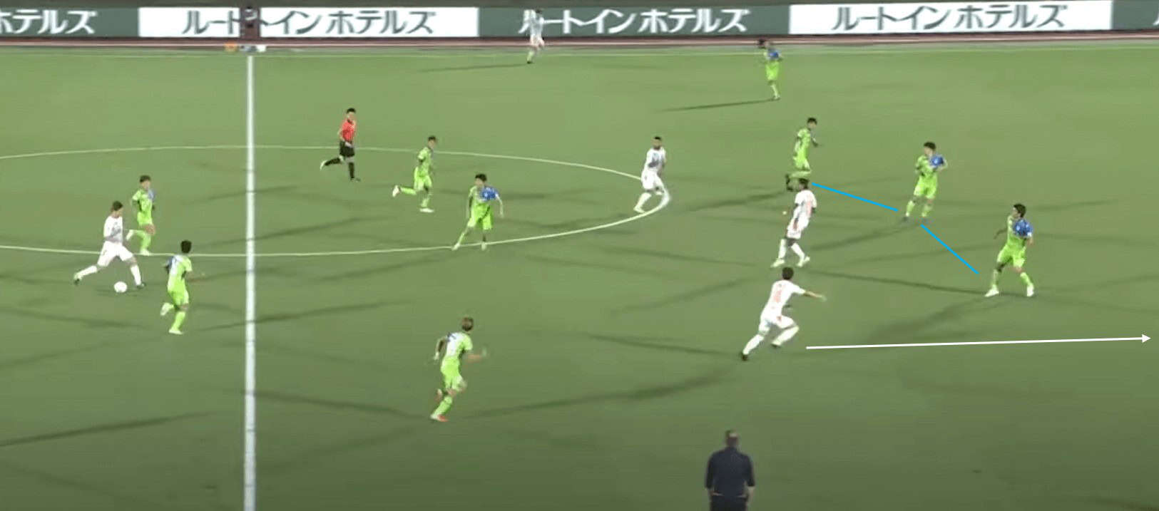 As can be seen in this annotation, in S-Pa’s 5-3-2 formation, the two wing-backs – Shota Kaneko and Kenta Nishizawa – were stationed much deeper. This allowed the away side to remain compact in a flat back five and enabled them to be quick in their transition into a defensive shape. While the two wing-backs did have offensive duties, they did not throw caution to the wind defensively.