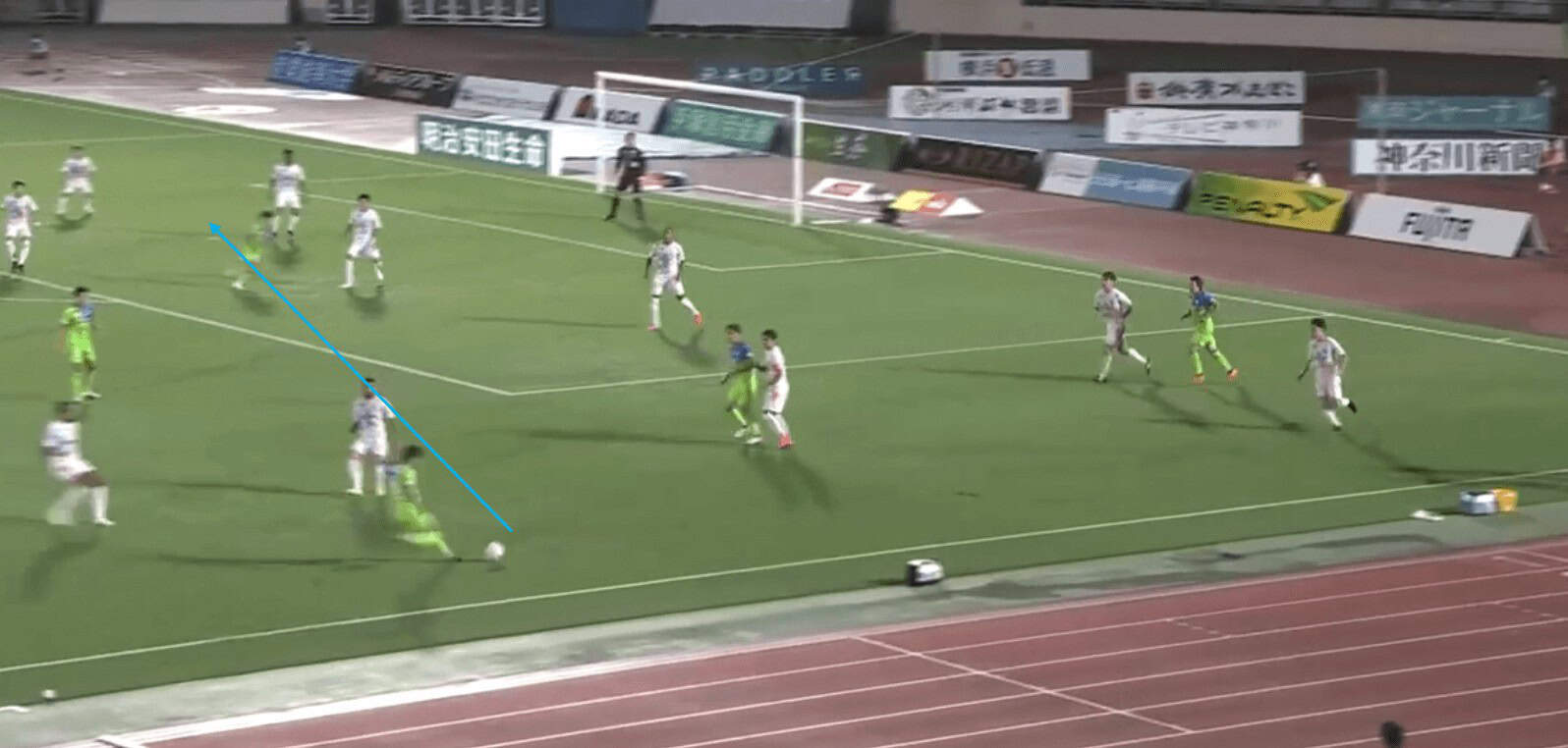 In this instance, Shonan Bellmare have been unable to get around Shimizu S-Pulse’s rigid defensive line and the ball has been played back to the crosser who hits a first-time ball into the box. The cross is then easily cleared by a defending player. This pattern of play was a result of S-Pa’s deeper positioned wing-backs.
