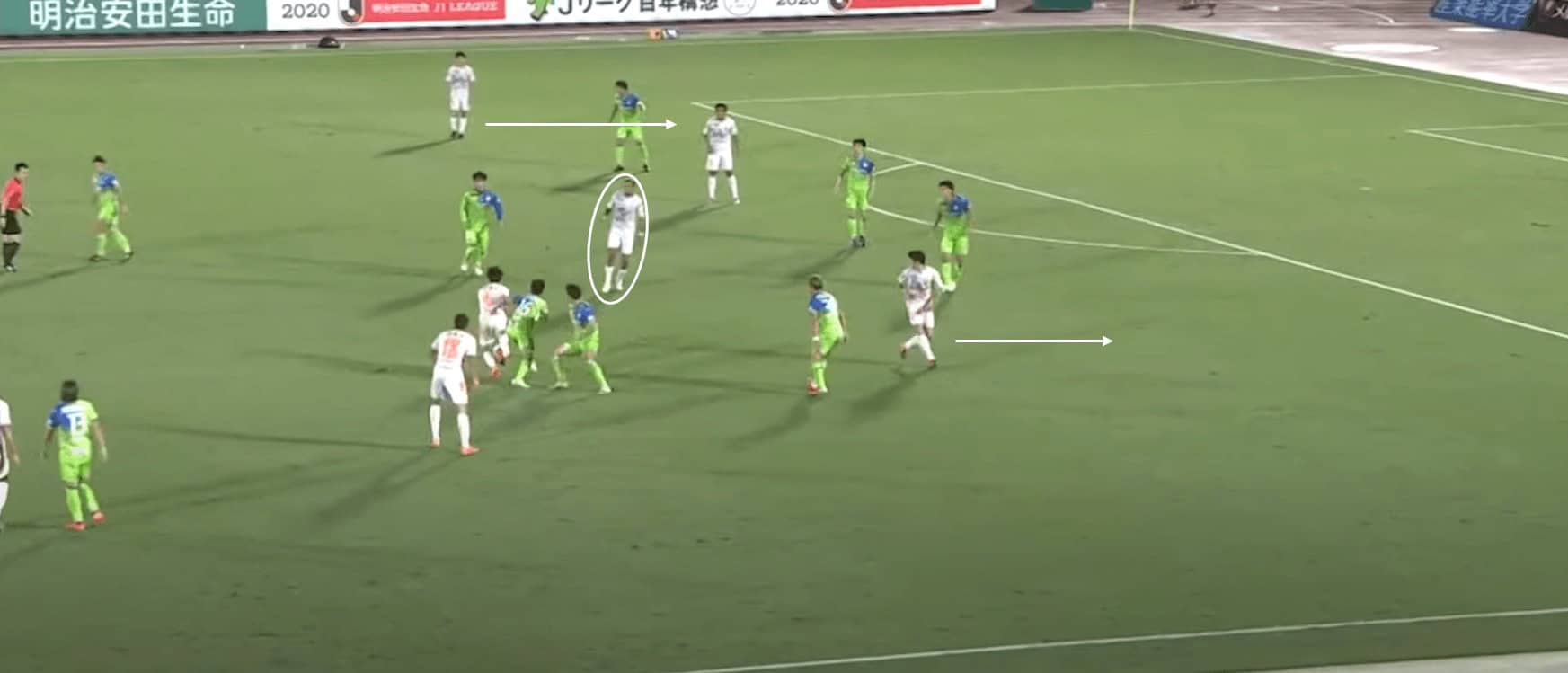 In their 3-5-2 formation, the two wide players – Shota Kobayashi and Hirokazu Ishihara – were listed as part of the midfield line, however, were still played as wing-backs. The two players were often stationed high and wide to provide the home side with some width. This, though, meant that Kobayashi and Ishihara were slow in transitioning into their defensive shape which was a 5-3-2 and often left the three central defenders exposed.