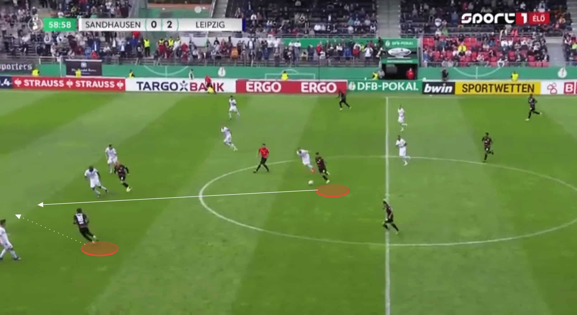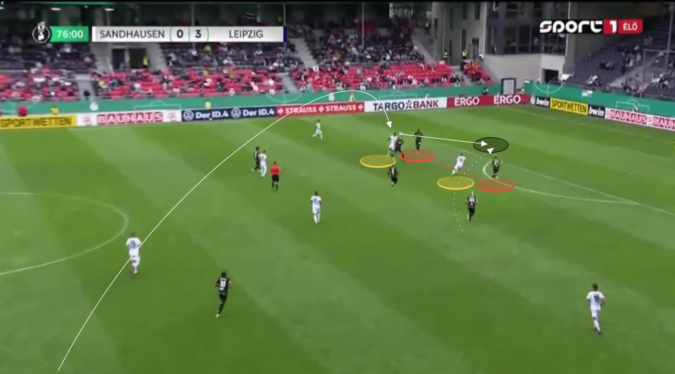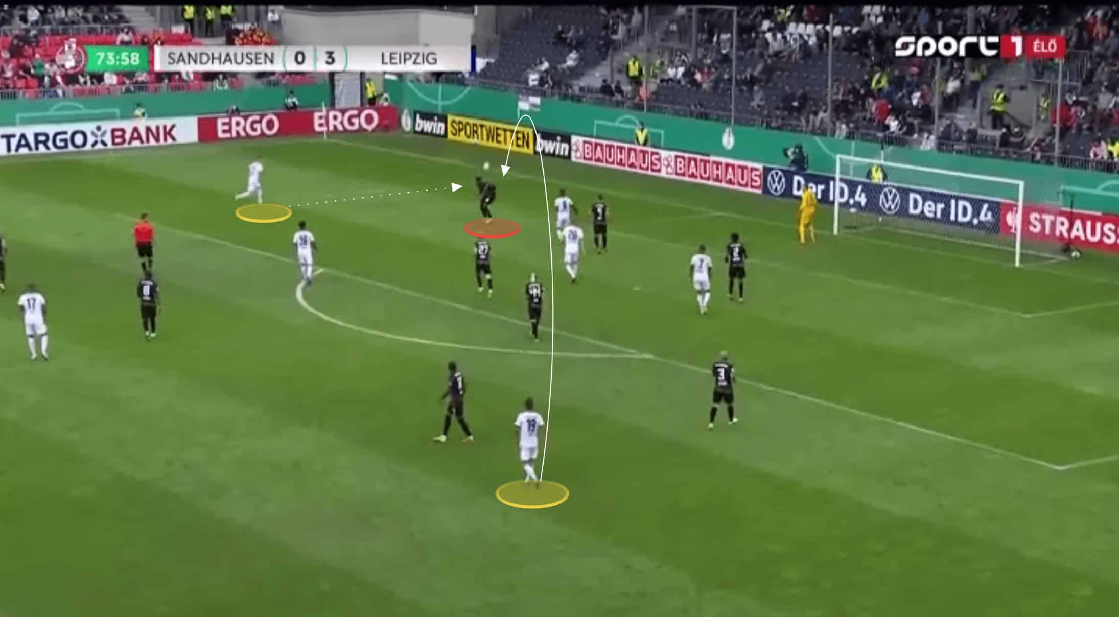 Haidara was instantly able to get on the ball facing the Sandhausen goal. With Nkunku’s movement drawing out the right-sided centre-back, centre-forward Andre Silva was essentially left with a 1v1. He used misdirection to draw his marker to one side before being played in behind. This was only in the third minute of the game, and whilst Andre Silva was unable to convert, it was an instant statement from Leipzig that they were going to be quick and incredibly effective at forging attacks should they win possession in the midfield.