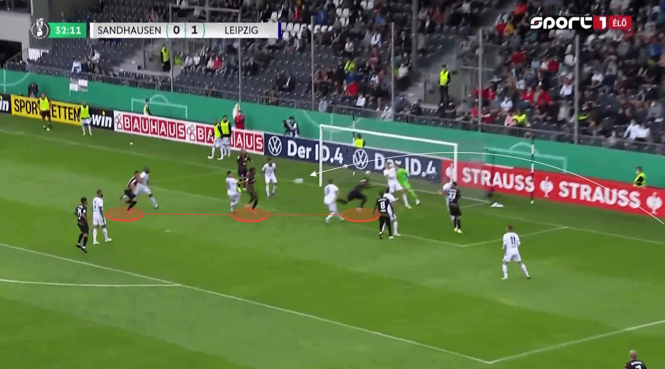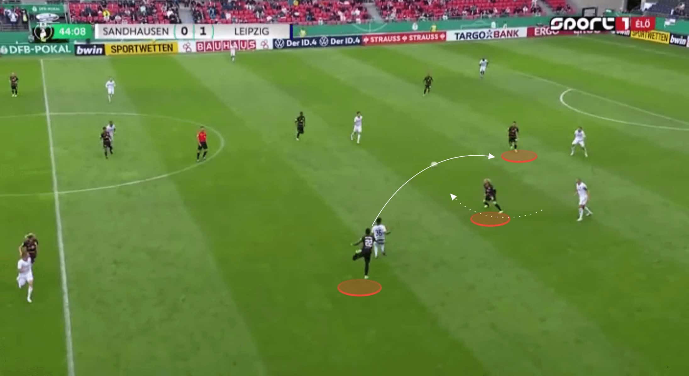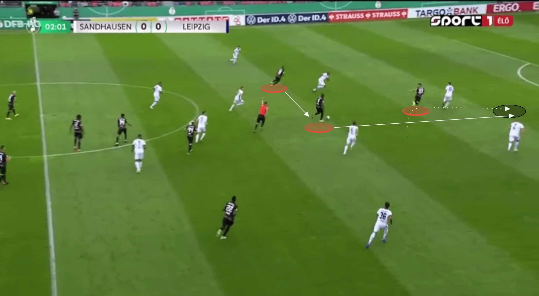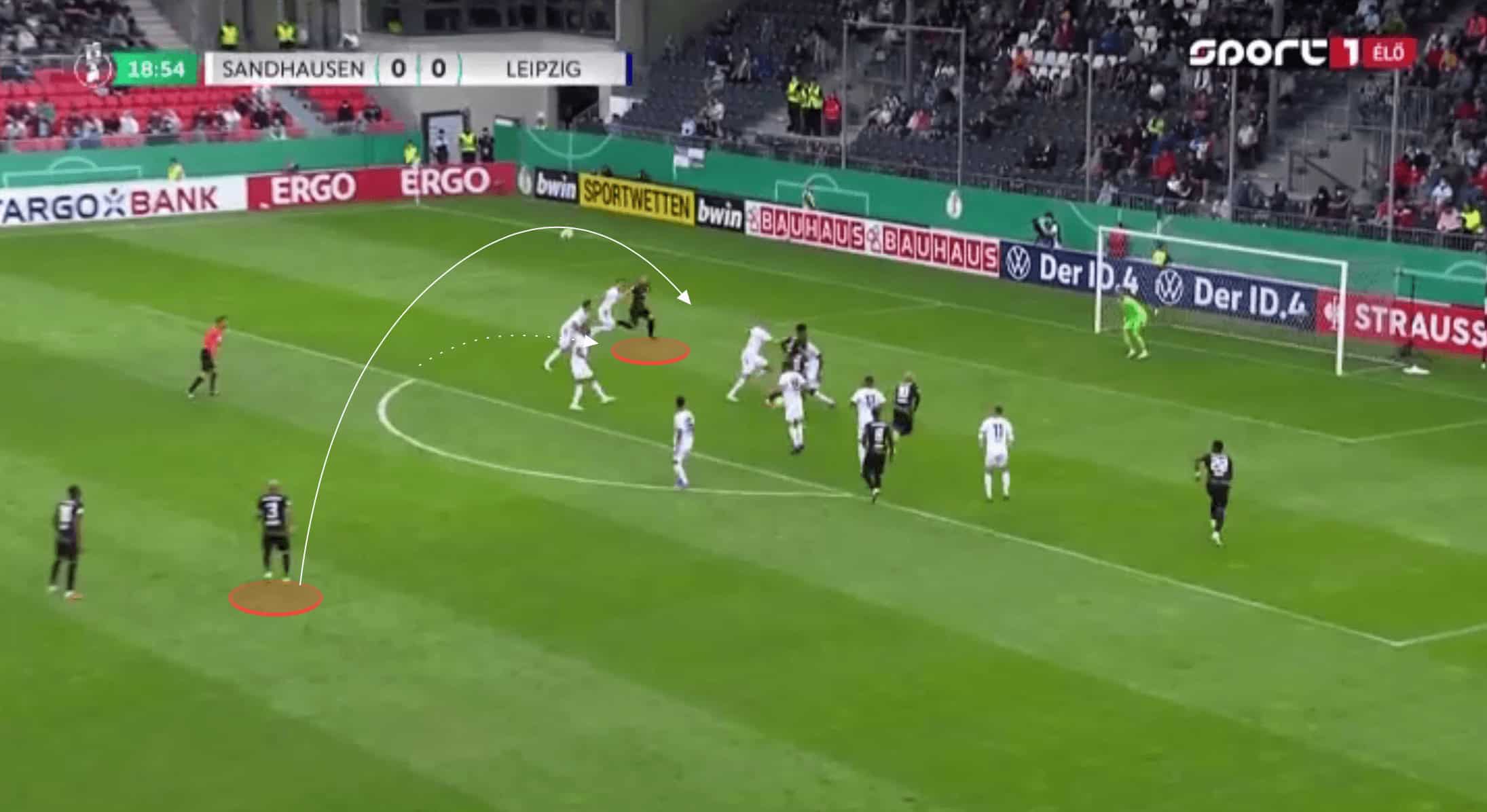 Haidara was instantly able to get on the ball facing the Sandhausen goal. With Nkunku’s movement drawing out the right-sided centre-back, centre-forward Andre Silva was essentially left with a 1v1. He used misdirection to draw his marker to one side before being played in behind. This was only in the third minute of the game, and whilst Andre Silva was unable to convert, it was an instant statement from Leipzig that they were going to be quick and incredibly effective at forging attacks should they win possession in the midfield.
