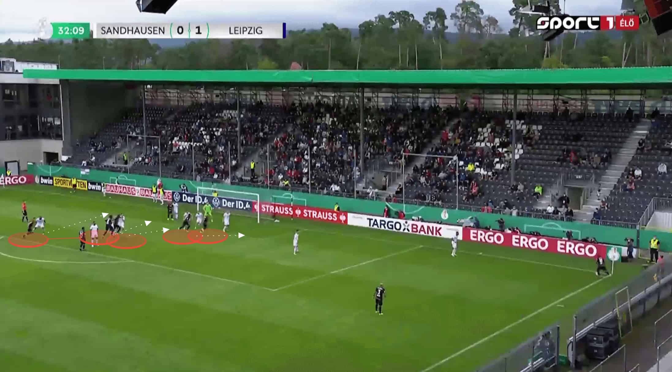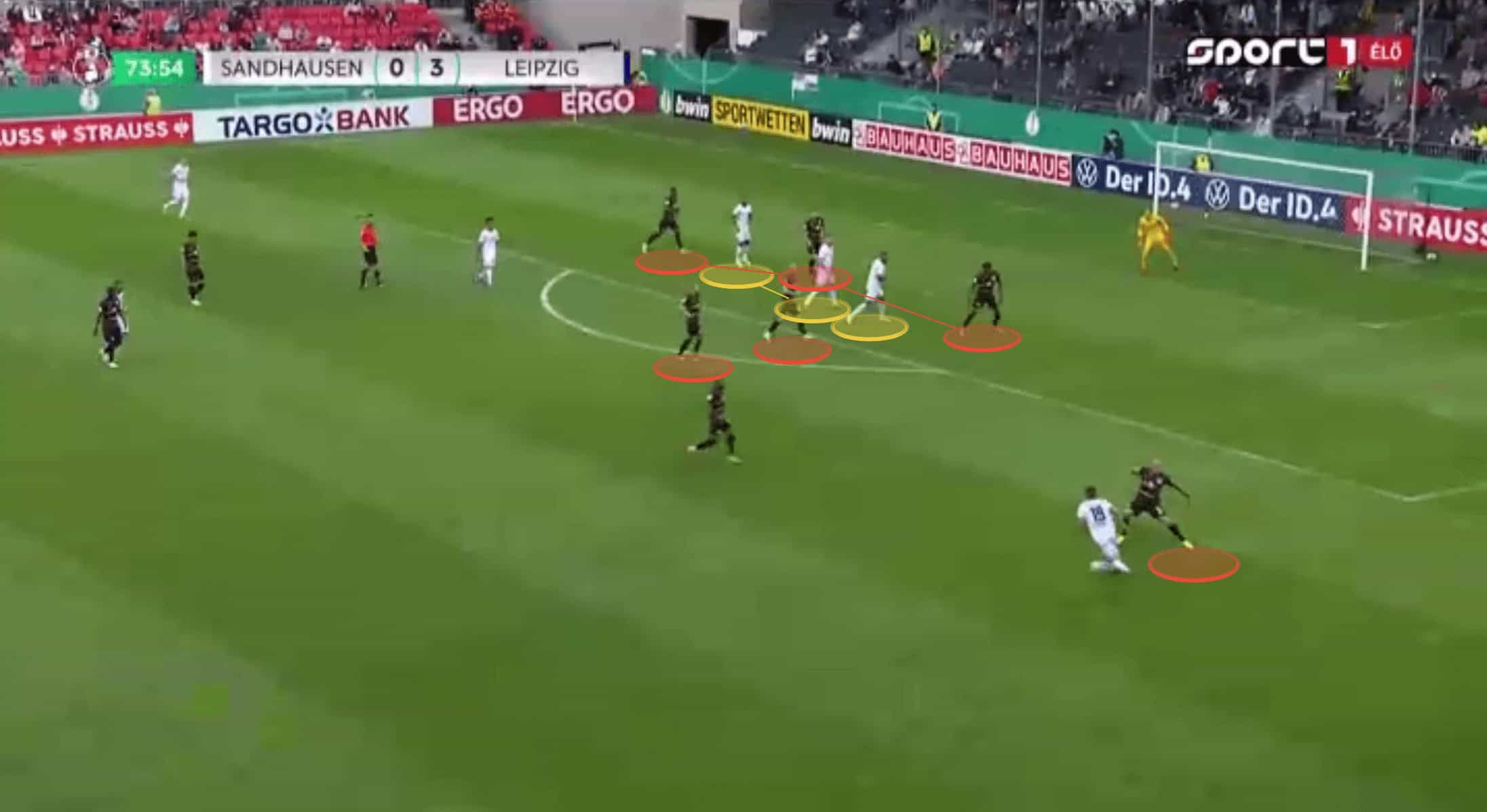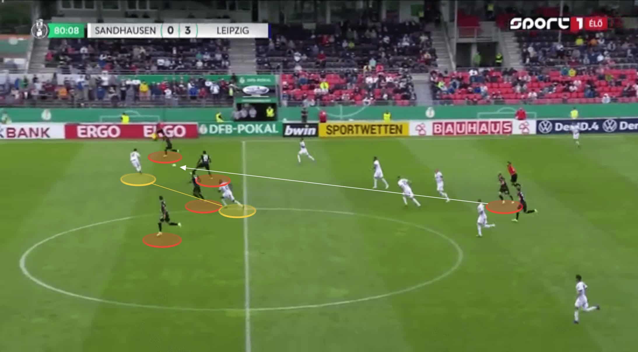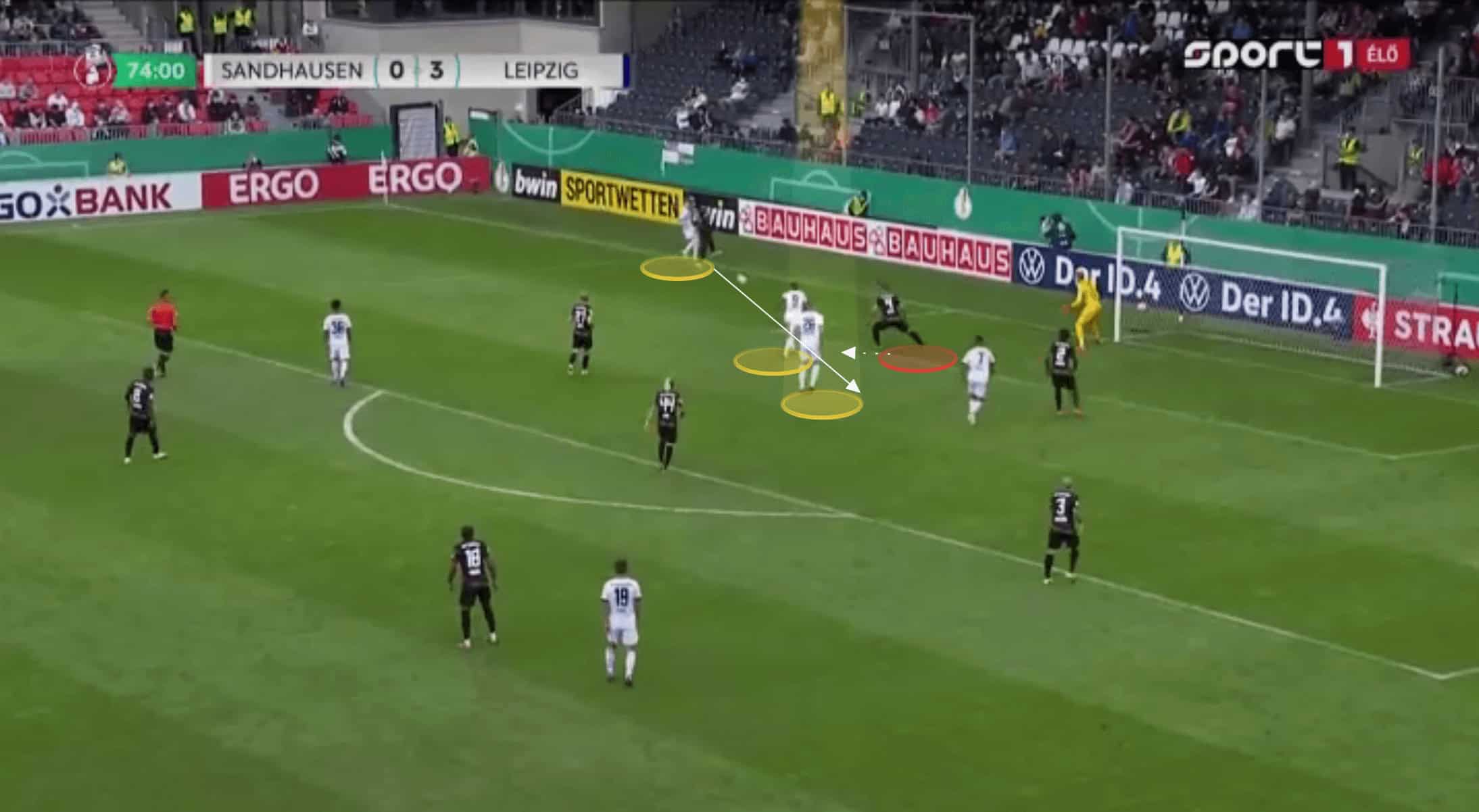 This turns the counter-attack into a 4v2, and we can see the number of Sandhausen players now removed by the pass, and failing to get back. Even with numerous defenders, having four attackers driving forward makes it so difficult to play against, but obviously, with only two in this instance, Leipzig were able to easily work the overload to their advantage and score their fourth and final goal of the game.