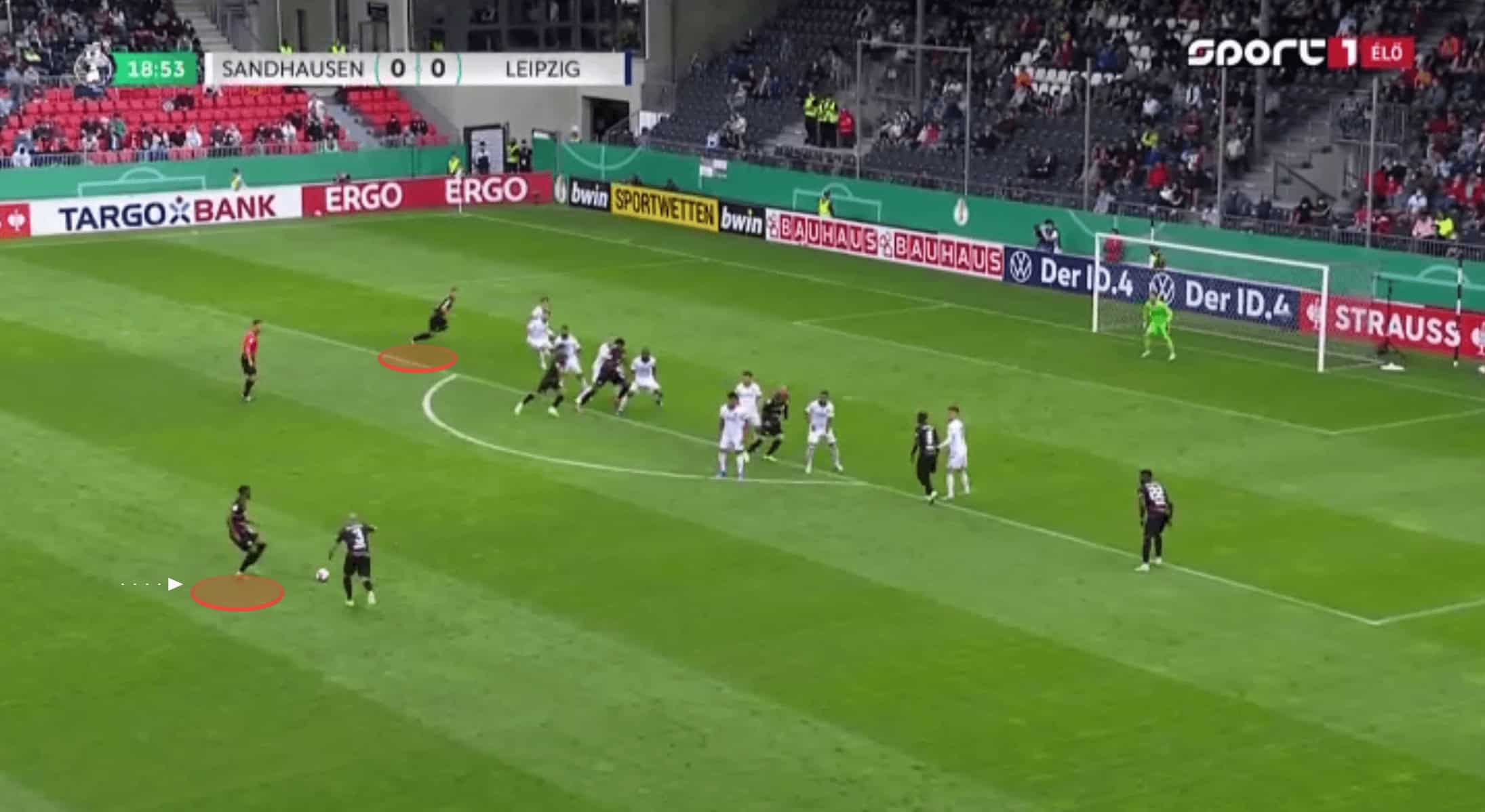 Similarly, albeit towards the end of the game with Sandhuasen’s energy levels dipping, but the next two images show the speed at which Leipzig would break forward, and how Sandhausen struggled to deal with this.