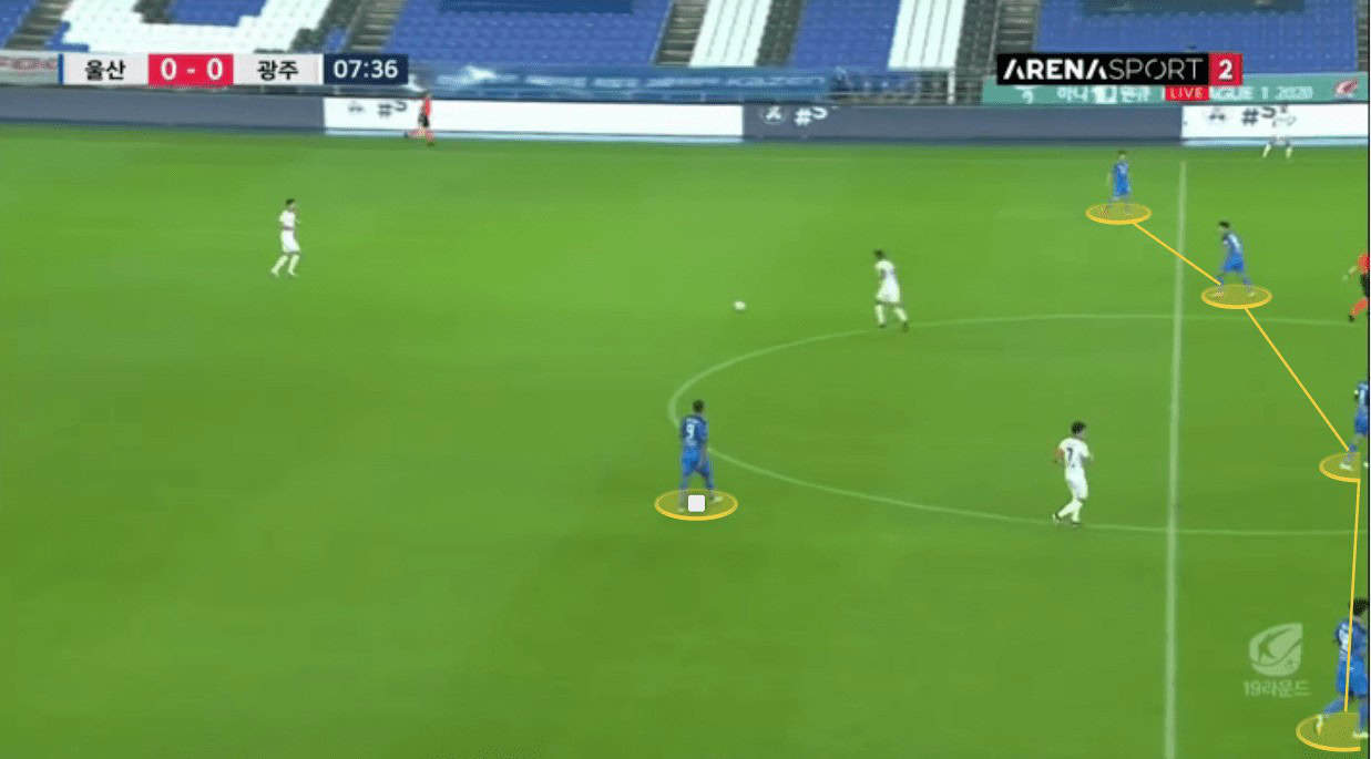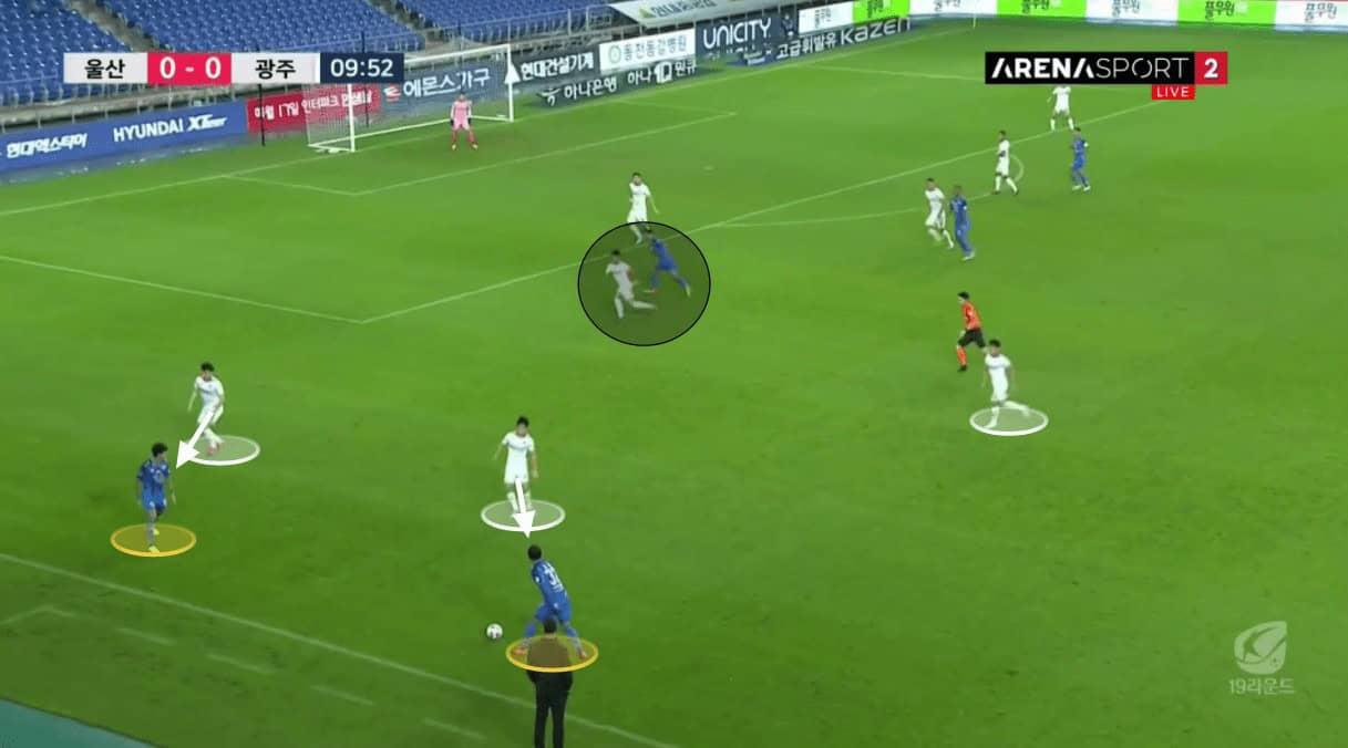 This was the story of the match in the early minutes. However, after a few minutes, the Horangi started to attack from the central corridors. Ulsan too like Gwangju pushed their full-backs high especially the right-back and the wingers would either invert to the half spaces or overload the wings.