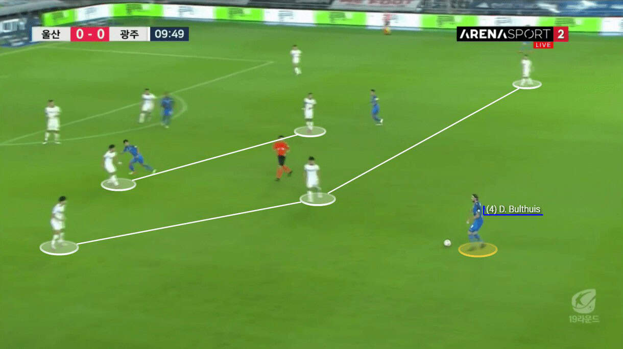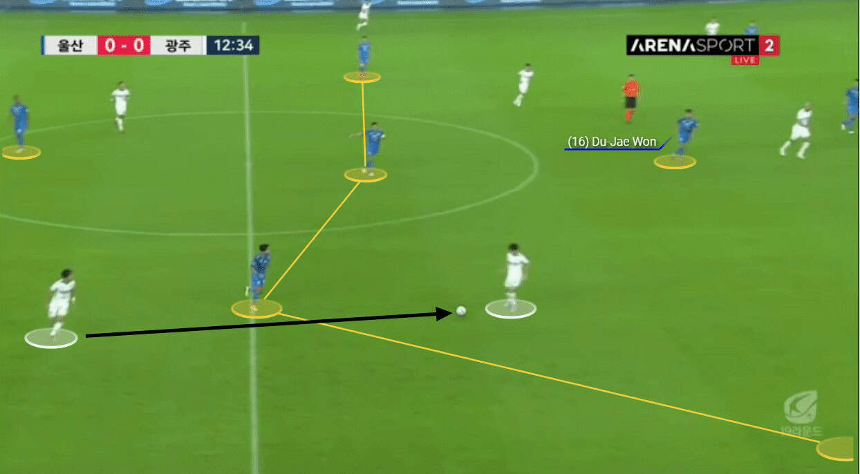 Generally, to exploit Ulsan’s 4-1-4-1 mid block, Gwangju would build-up in a 2-2-5-1 looking formation with the left-back and right-back joining the wingers and the attacking midfielder.