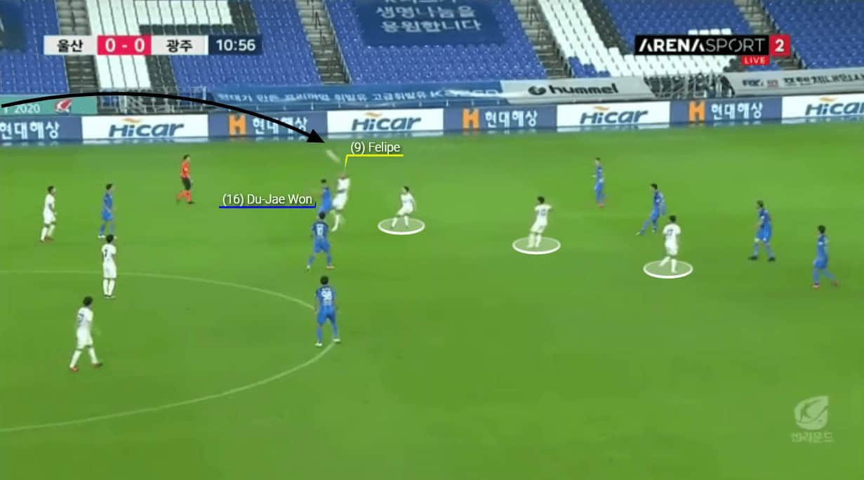 Other than this short build-up, Gwangju generally opted to go with long balls from the goalkeeper. The basic idea was to utilise the height of Felipe (CF). Yun Pyeong-gook (GK) would normally play a long ball to the area Won Du-jae was covering. The 6’4” striker would drop deeper to win the easy aerial duels owing to his height and the three other attacking players of Gwangju would position themselves in between the lines or with the last line of Ulsan’s defence.