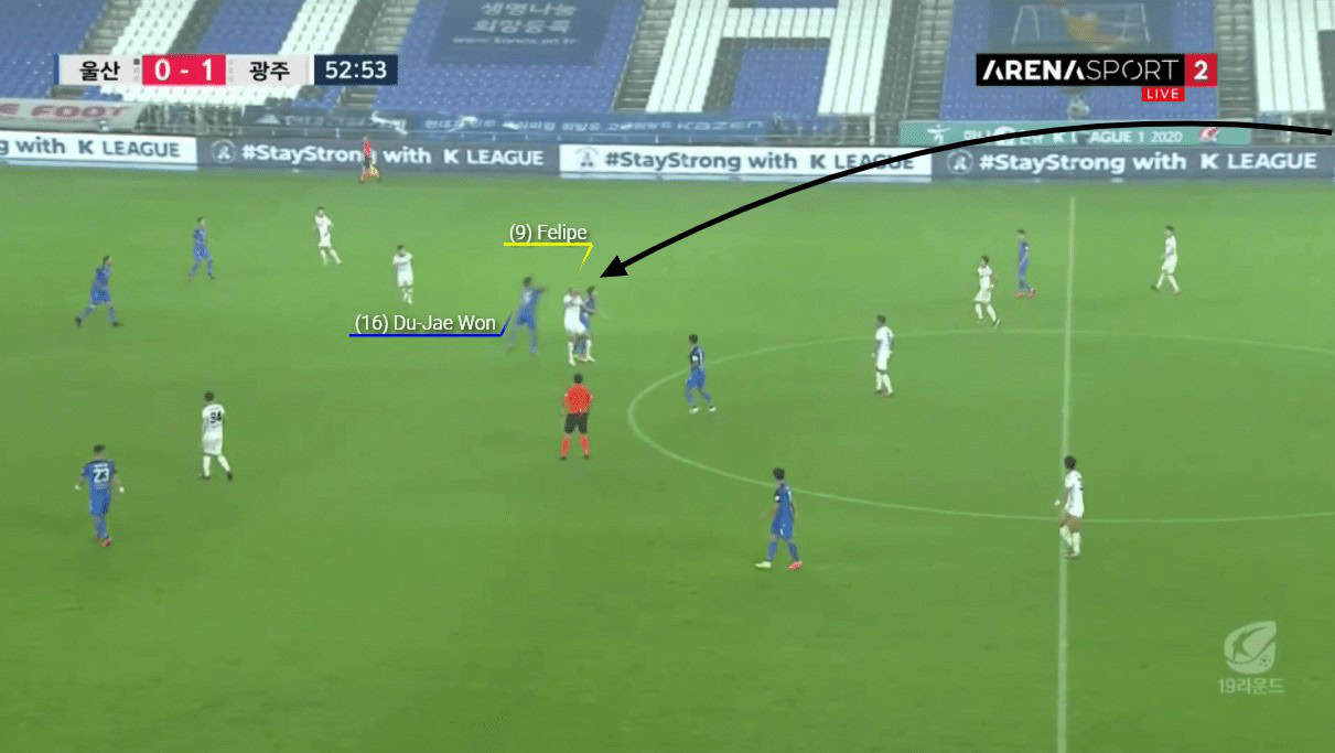 However, after Felipe winning three out of three such aerial battles in the first 30 minutes, Ulsan came out with a better strategy to not lose the aerial battles to Felipe.