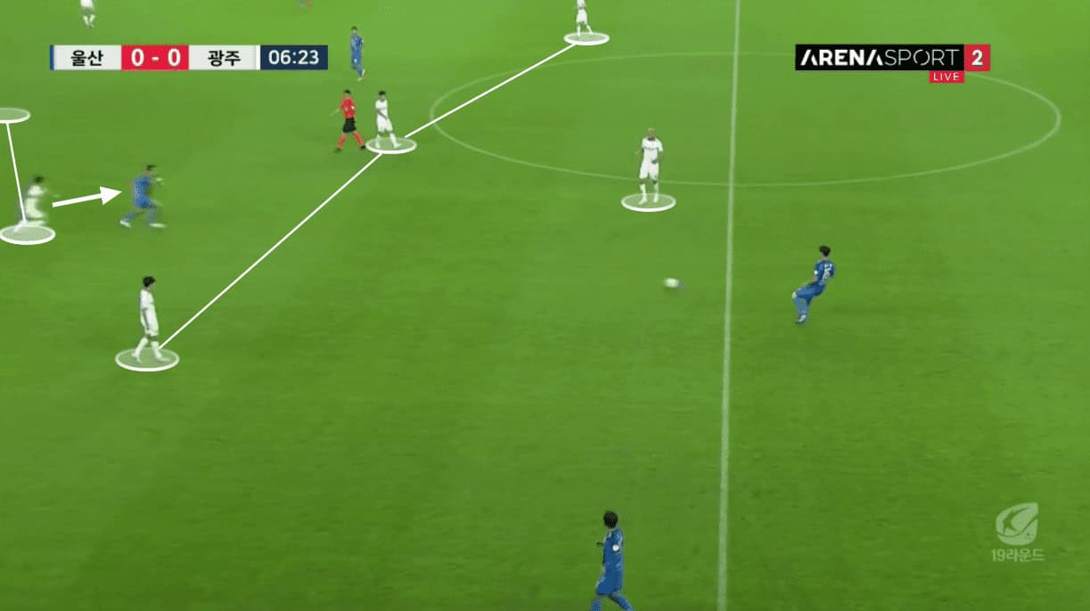 When the centre-back would carry the ball to the final third, a Gwangju midfielder would move up to press the centre-back and most of the time the centre-back would pass the ball to the flank.