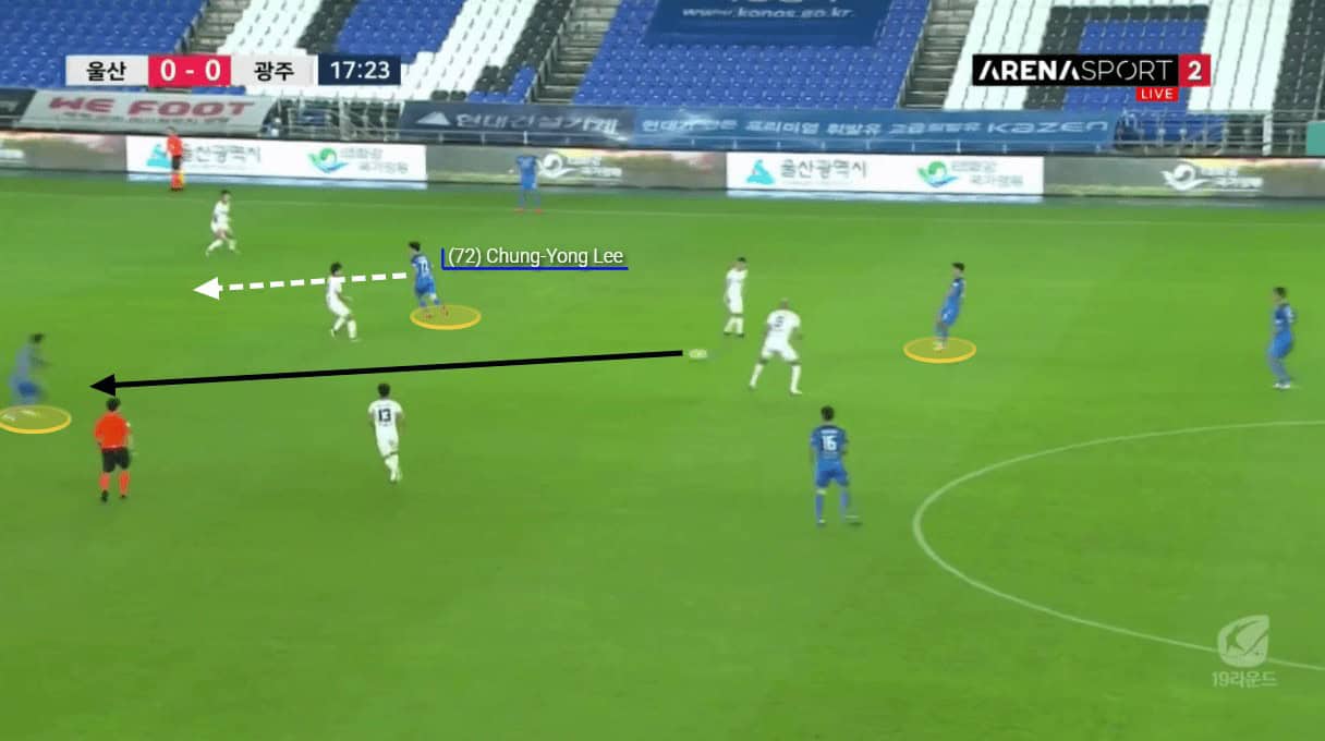 As you can see here, Lee Chung-yong (RW) (former Bolton Wanderers and Crystal Palace winger) inverts into the half space and engages Park Jeong-Su (LCM) and drags him away from his zone for his dropping teammate to occupy the zone and exploit it.
